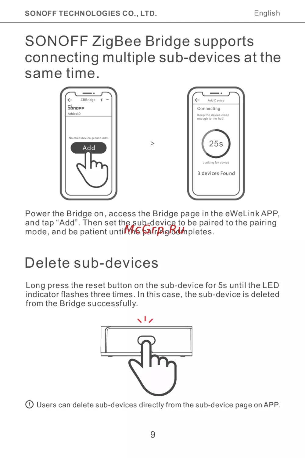 - Access ewelink app select the bridge that you want to connect and tap add to add a sub device then long press reset button on the device for 5s until the led indicator flashes three times which means the device has entered the pairing mode and be patient until pairing completes p.8