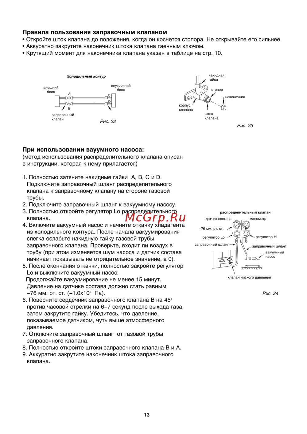 Правила пользования заправочным клапаном Откройте шток клапана до положения когда он коснется стопора Не открывайте его сильнее Аккуратно закрутите наконечник штока клапана гаечным ключом Крутящий момент для наконечника клапана указан в таблице на стр 10 Холодильный контур внешний блок заправочный клапан Рис 22 Рис 23 При использовании вауумного насоса метод использования распределительного клапана описан в инструкции которая к нему прилагается 1 Полностью затяните накидные гайки А В С и О Подключите заправочный шланг распределительного клапана к заправочному клапану на стороне газовой трубы 2 Подключите заправочный шланг к вакуумному насосу 3 Полностью откройте регулятор Ьо распределительного клапана 4 Включите вакуумный насос и начните откачку хладагента из холодильного контура После начала вакуумирования слегка ослабьте накидную гайку газовой трубы заправочного клапана Проверьте входит ли воздух в трубу при этом изменяется шум насоса и датчик состава начинает показывать не отрицательное значение а 0 5 После окончания откачки полностью закройте регулятор 1_о и выключите вакуумный насос Продолжайте вакуумирование не менее 15 минут Давление на датчике состава должно стать равным 76 мм рт ст 1 0x105 Па 6 Поверните сердечник заправочного клапана В на 45 против часовой стрелки на 6 7 секунд после выхода газа затем закрутите гайку Убедитесь что давление показываемое датчиком чуть выше атмосферного давления 7 Отключите заправочный шланг от газовой трубы заправочного клапана 8 Полностью откройте штоки заправочного клапана В и А 9 Аккуратно закрутите наконечник штока заправочного клапана 13 распределительный клапан Рис 24