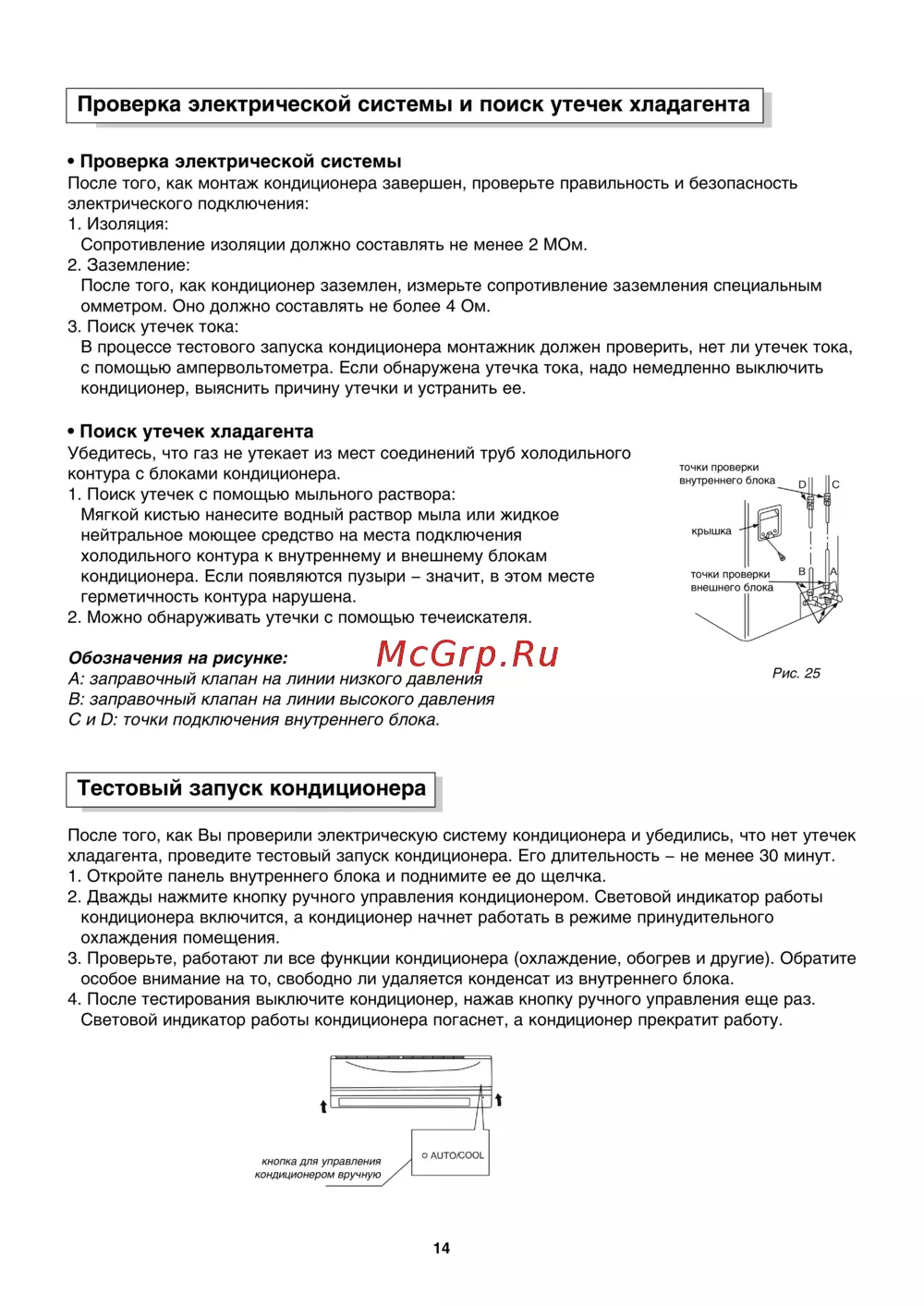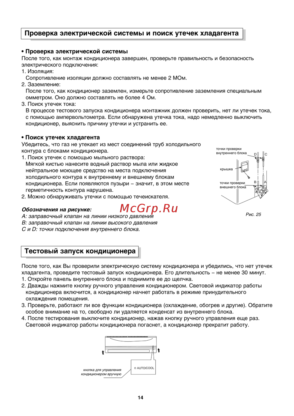 Проверка электрической системы и поиск утечек хладагента Проверка электрической системы После того как монтаж кондиционера завершен проверьте правильность и безопасность электрического подключения 1 Изоляция Сопротивление изоляции должно составлять не менее 2 МОм 2 Заземление После того как кондиционер заземлен измерьте сопротивление заземления специальным омметром Оно должно составлять не более 4 Ом 3 Поиск утечек тока В процессе тестового запуска кондиционера монтажник должен проверить нет ли утечек тока с помощью ампервольтометра Если обнаружена утечка тока надо немедленно выключить кондиционер выяснить причину утечки и устранить ее Поиск утечек хладагента Убедитесь что газ не утекает из мест соединений труб холодильного контура с блоками кондиционера 1 Поиск утечек с помощью мыльного раствора Мягкой кистью нанесите водный раствор мыла или жидкое нейтральное моющее средство на места подключения холодильного контура к внутреннему и внешнему блокам кондиционера Если появляются пузыри значит в этом месте герметичность контура нарушена 2 Можно обнаруживать утечки с помощью течеискателя оц с лО ЕЦ крышка Ы ъ точки проверки внешнего блока Обозначения на рисунке А заправочный клапан на линии низкого давления В заправочный клапан на линии высокого давления С и О точки подключения внутреннего блока Тестовый запуск кондиционера После того как Вы проверили электрическую систему кондиционера и убедились что нет утечек хладагента проведите тестовый запуск кондиционера Его длительность не менее 30 минут 1 Откройте панель внутреннего блока и поднимите ее до щелчка 2 Дважды нажмите кнопку ручного управления кондиционером Световой индикатор работы кондиционера включится а кондиционер начнет работать в режиме принудительного охлаждения помещения 3 Проверьте работают ли все функции кондиционера охлаждение обогрев и другие Обратите особое внимание на то свободно ли удаляется конденсат из внутреннего блока 4 После тестирования выключите кондиционер нажав кнопку ручного управления еще раз Световой индикатор работы кондиционера погаснет а кондиционер прекратит работу кнопка для управления кондиционером вручную О AUTO COOL 14