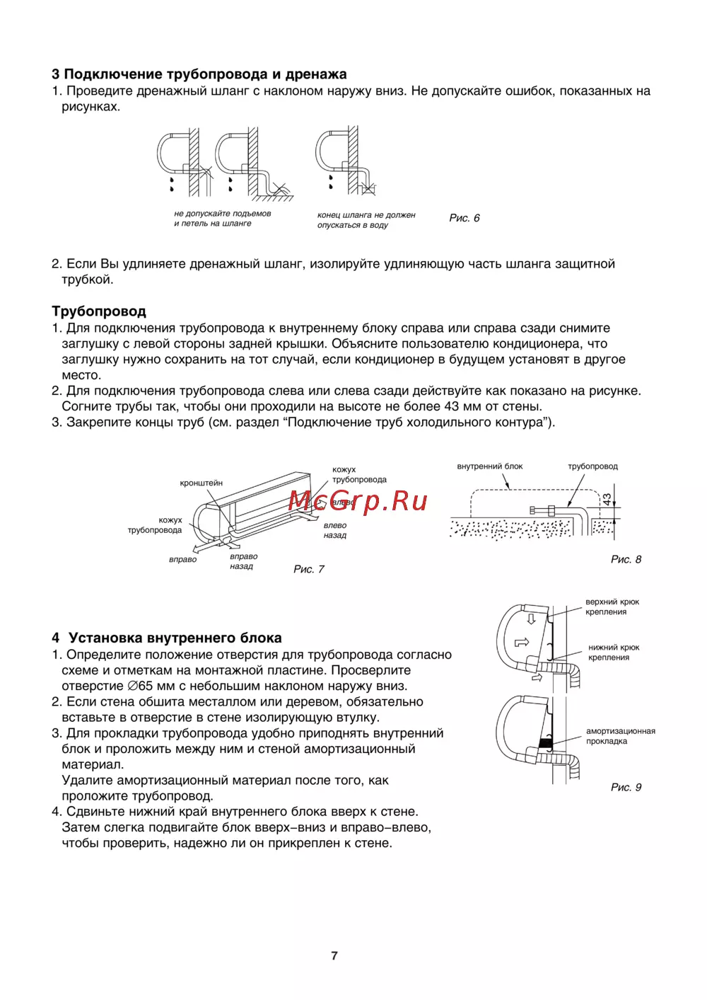 3 Подключение трубопровода и дренажа 1 Проведите дренажный шланг с наклоном наружу вниз Не допускайте ошибок показанных на рисунках не допускайте подъемов и петель на шланге конец шланга не должен опускаться в воду Рис 6 2 Если Вы удлиняете дренажный шланг изолируйте удлиняющую часть шланга защитной трубкой Трубопровод 1 Для подключения трубопровода к внутреннему блоку справа или справа сзади снимите заглушку с левой стороны задней крышки Объясните пользователю кондиционера что заглушку нужно сохранить на тот случай если кондиционер в будущем установят в другое место 2 Для подключения трубопровода слева или слева сзади действуйте как показано на рисунке Согните трубы так чтобы они проходили на высоте не более 43 мм от стены 3 Закрепите концы труб см раздел Подключение труб холодильного контура Рис 8 4 Установка внутреннего блока 1 Определите положение отверстия для трубопровода согласно схеме и отметкам на монтажной пластине Просверлите отверстие 065 мм с небольшим наклоном наружу вниз 2 Если стена обшита месталлом или деревом обязательно вставьте в отверстие в стене изолирующую втулку 3 Для прокладки трубопровода удобно приподнять внутренний блок и проложить между ним и стеной амортизационный материал Удалите амортизационный материал после того как проложите трубопровод 4 Сдвиньте нижний край внутреннего блока вверх к стене Затем слегка подвигайте блок вверх вниз и вправо влево чтобы проверить надежно ли он прикреплен к стене 7