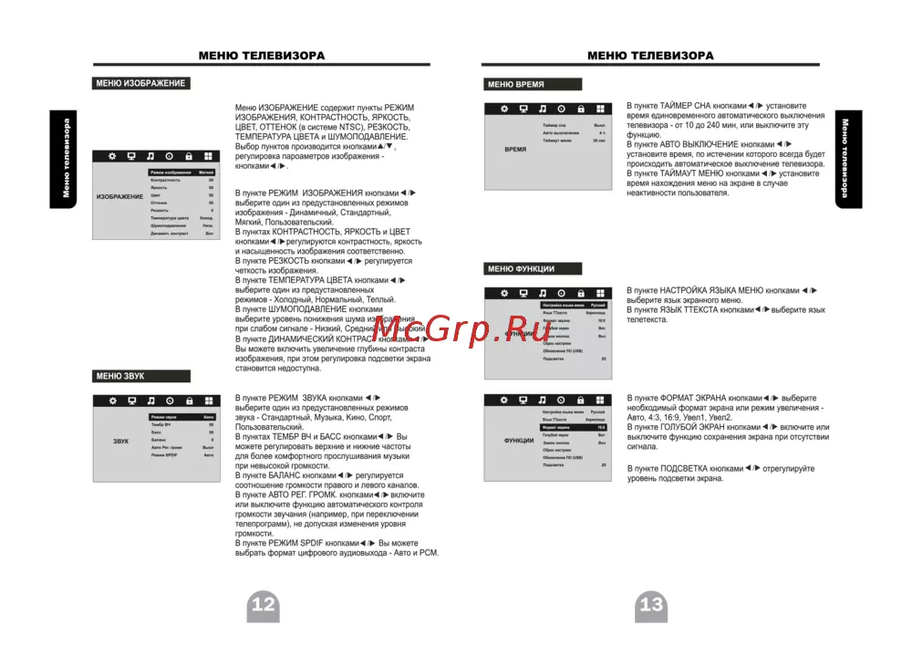 МЕНЮ ТЕЛЕВИЗОРА МЕНЮ ИЗОБРАЖЕНИЕ МЕНЮ ТЕЛЕВИЗОРА МЕНЮ ВРЕМЯ Меню телевизора В пункте РЕЖИМ ИЗОБРАЖЕНИЯ кнопками выберите один из предустановленных режимов изображения Динамичный Стандартный Мягкий Пользовательский В пунктах КОНТРАСТНОСТЬ ЯРКОСТЬ и ЦВЕТ кнопками регулируются контрастность яркость и насыщенность изображения соответственно В пункте РЕЗКОСТЬ кнопками регулируется четкость изображения В пункте ТЕМПЕРАТУРА ЦВЕТА кнопками выберите один из предустановленных режимов Холодный Нормальный Теплый В пункте ШУМОПОДАВЛЕНИЕ кнопками выберите уровень понижения шума изображения при слабом сигнале Низкий Средний или Высокий В пункте ДИНАМИЧЕСКИЙ КОНТРАСТ кнопками Вы можете включить увеличение глубины контраста изображения при этом регулировка подсветки экрана становится недоступна МЕНЮ ФУНКЦИИ Q л о в Настройка языка меню Русский Язык ТТекста Кириллица Формат экрана 16 9 Голубой экран Вкл В пункте НАСТРОЙКА ЯЗЫКА МЕНЮ кнопками выберите язык экранного меню В пункте ЯЗЫК ТТЕКСТА кнопками выберите язык телетекста ФУНКЦИИ Эа о попок Сброс настроек Обновление ПО USB Подсветка 20 МЕНЮ ЗВУК з л о а Режим звука ЗВУК Кино Тембр ВЧ 50 Басс 50 Баланс Авто Per громк Режим SPDIF 0 Выкл Авто В пункте РЕЖИМ ЗВУКА кнопками выберите один из предустановленных режимов звука Стандартный Музыка Кино Спорт Пользовательский В пунктах ТЕМБР ВЧ и БАСС кнопками Вы можете регулировать верхние и нижние частоты для более комфортного прослушивания музыки при невысокой громкости В пункте БАЛАНС кнопками регулируется соотношение громкости правого и левого каналов В пункте АВТО РЕГ ГРОМК кнопками включите или выключите функцию автоматического контроля громкости звучания например при переключении телепрограмм не допуская изменения уровня громкости В пункте РЕЖИМ SPDIF кнопками Вы можете выбрать формат цифрового аудиовыхода Авто и РСМ В пункте ФОРМАТ ЭКРАНА кнопкамиЧ выберите необходимый формат экрана или режим увеличения Авто 4 3 16 9 Увел1 Увел2 В пункте ГОЛУБОЙ ЭКРАН кнопками включите или выключите функцию сохранения экрана при отсутствии сигнала В пункте ПОДСВЕТКА кнопками отрегулируйте уровень подсветки экрана Меню телевизора В пункте ТАЙМЕР СНА кнопками установите время единовременного автоматического выключения телевизора от 10 до 240 мин или выключите эту функцию В пункте АВТО ВЫКЛЮЧЕНИЕ кнопками установите время по истечении которого всегда будет происходить автоматическое выключение телевизора В пункте ТАЙМАУТ МЕНЮ кнопками установите время нахождения меню на экране в случае неактивности пользователя Меню ИЗОБРАЖЕНИЕ содержит пункты РЕЖИМ ИЗОБРАЖЕНИЯ КОНТРАСТНОСТЬ ЯРКОСТЬ ЦВЕТ ОТТЕНОК в системе NTSC РЕЗКОСТЬ ТЕМПЕРАТУРА ЦВЕТА и ШУМОПОДАВЛЕНИЕ Выбор пунктов производится кнопкамиА Т регулировка пароаметров изображения кнопками