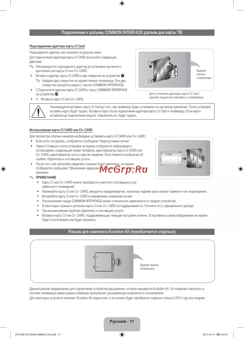 Рекомендуется вставить карту CI Card до того, как телевизор будет установлен на настенное крепление. После установки
