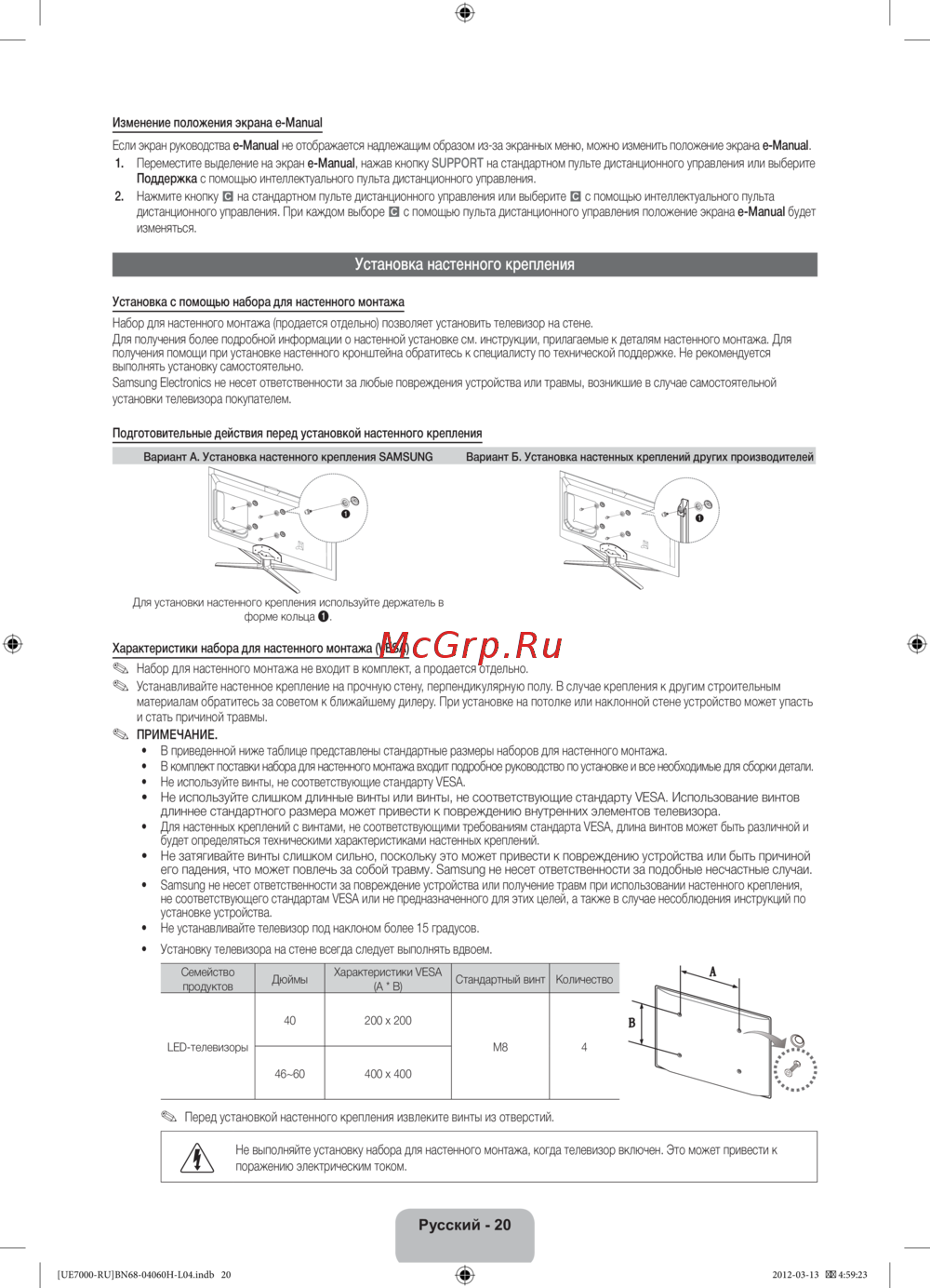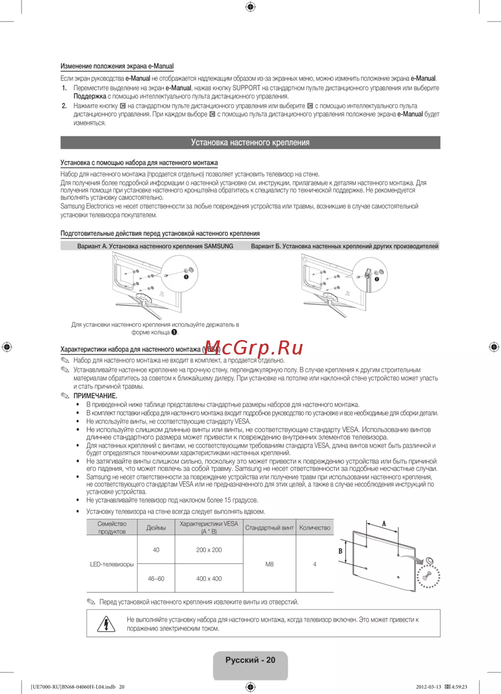 • Установку телевизора на стене всегда следует выполнять вдвоем.