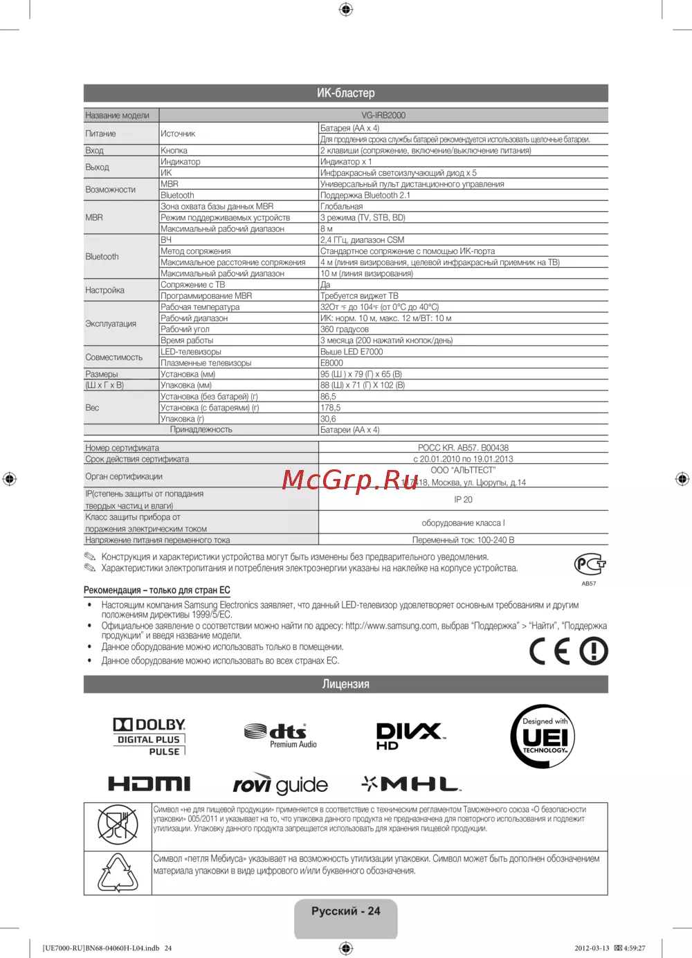 - Символ петля мебиуса указывает на возможность утилизации упаковки символ может быть дополнен обозначением материала упаковки в виде цифрового и или буквенного обозначения p.24