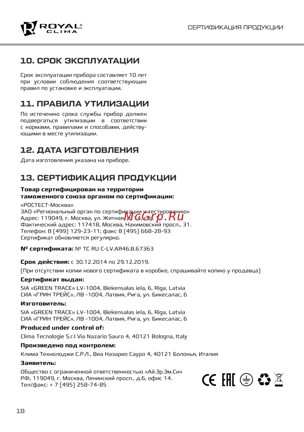 Royal Clima CO-4C 36HN — сертификация и эксплуатация приборов: правила и сроки [18/20]