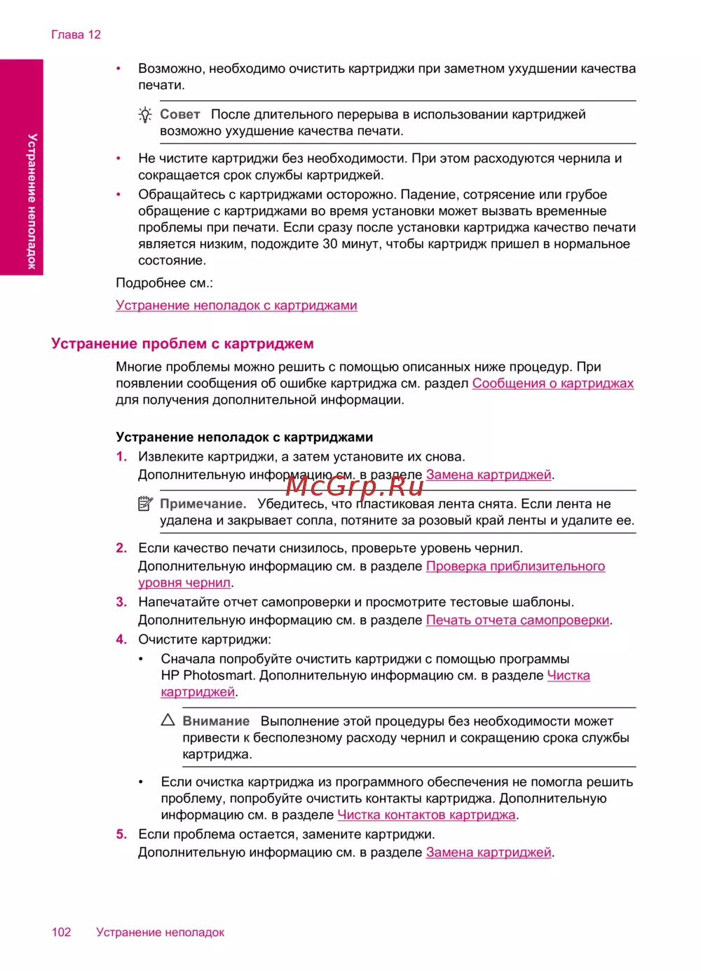 • Если очистка картриджа из программного обеспечения не помогла решить