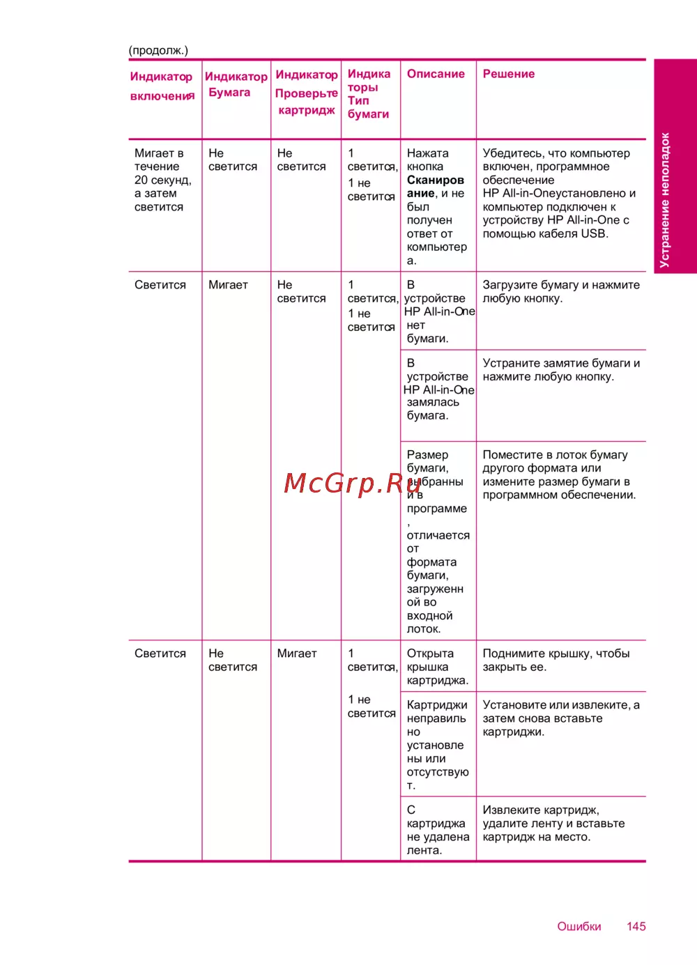 - Индикаторы на устройстве hp all in one мигают определенным образом сообщая о различных ошибках для получения информации об устранении ошибок о которых сообщают мигающие или светящиеся индикаторы hp all in one см следующую таблицу p.147