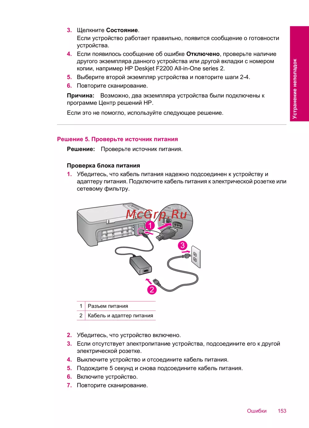 HP Deskjet F2200 All-in-One — устранение неполадок устройства: проверка состояния и питания [156/243]