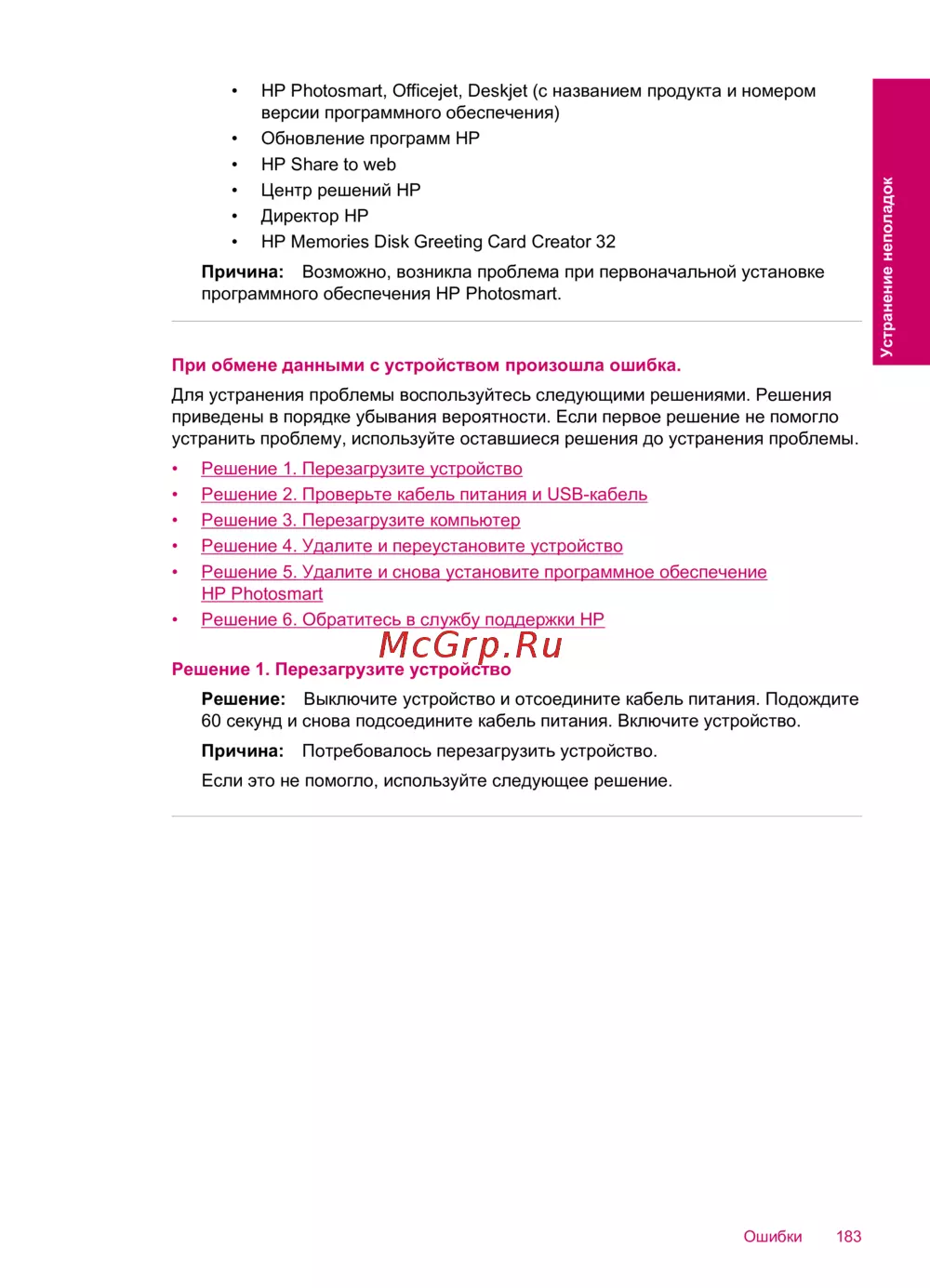 Решение: Выключите устройство и отсоедините кабель питания. Подождите