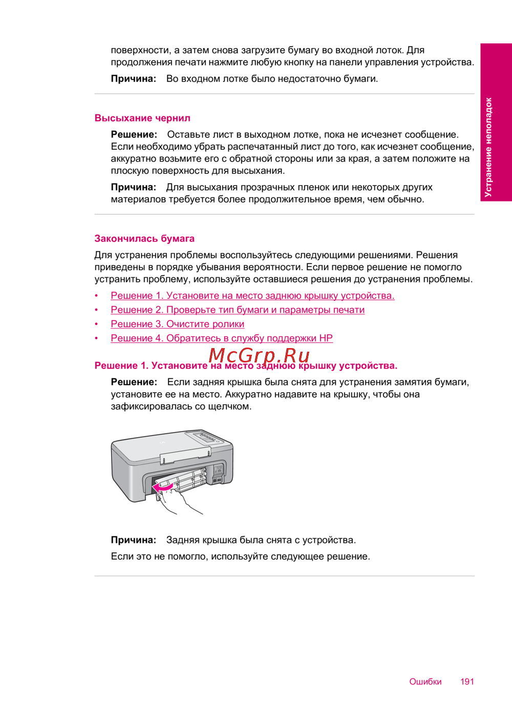 Решение: Если задняя крышка была снята для устранения замятия бумаги,