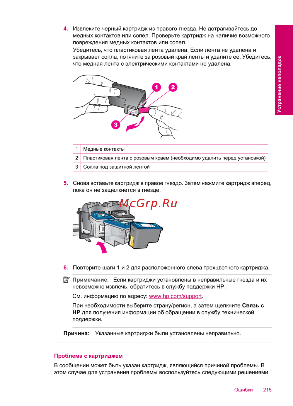 медных контактов или сопел. Проверьте картридж на наличие возможного