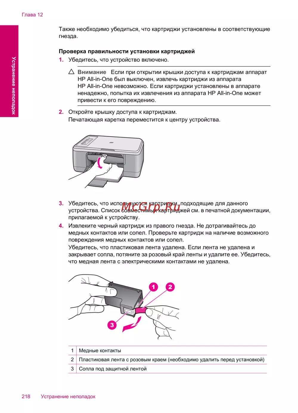 медных контактов или сопел. Проверьте картридж на наличие возможного