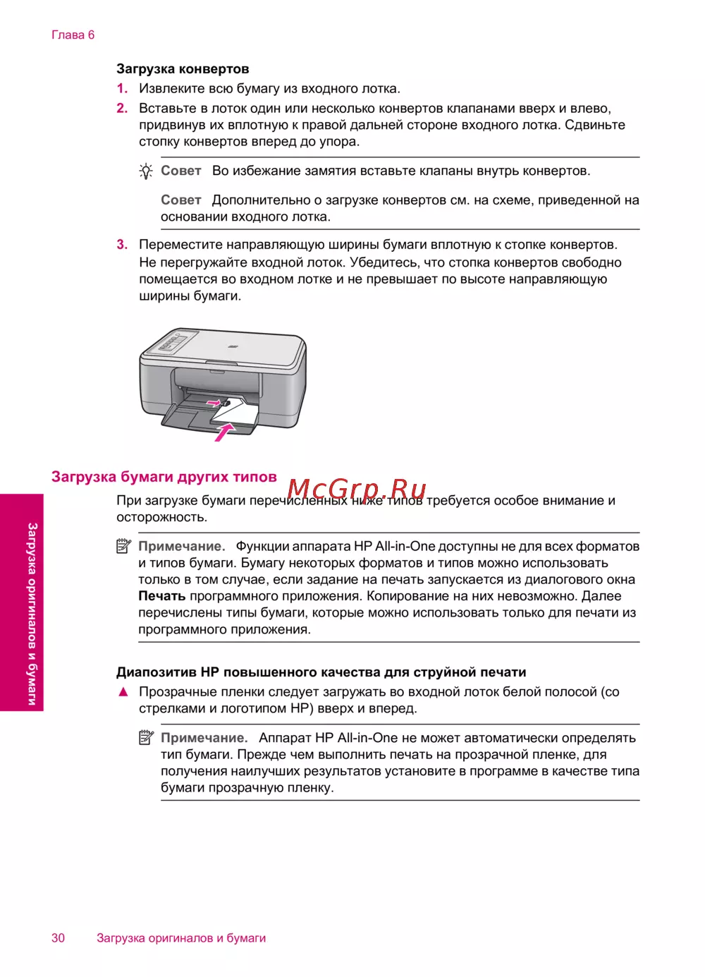 HP Deskjet F2200 All-in-One — правильная загрузка конвертов и бумаги в печатающее устройство [33/243]
