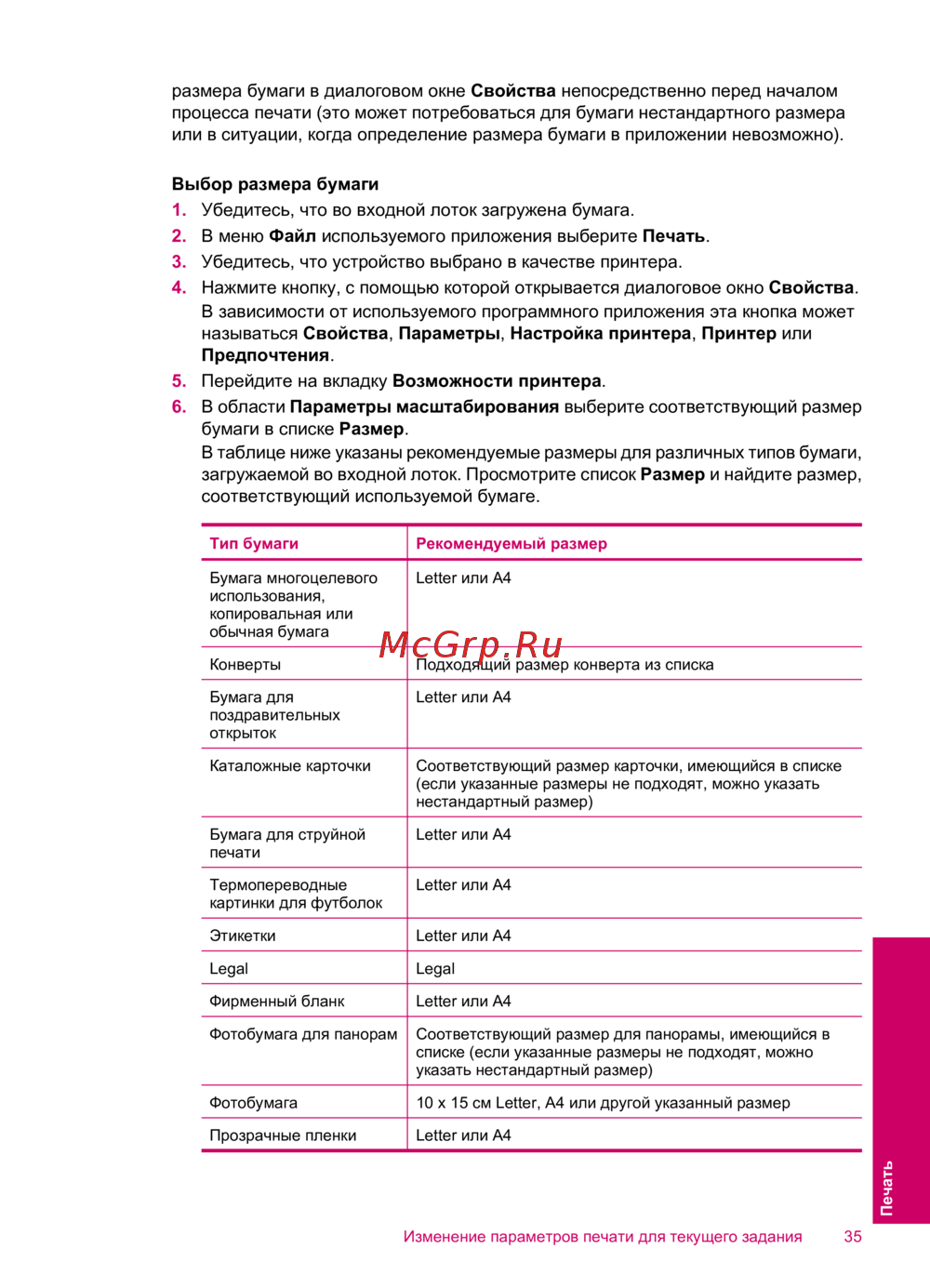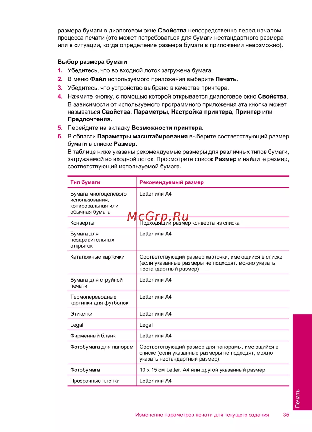 процесса печати (это может потребоваться для бумаги нестандартного размера