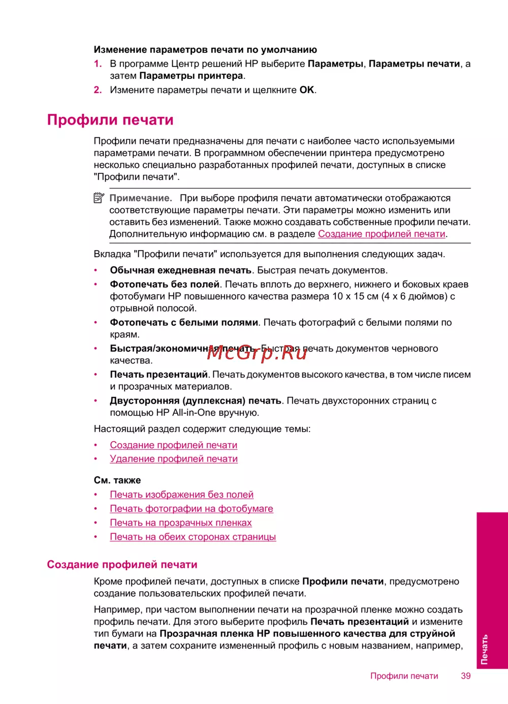 Кроме профилей печати, доступных в списке Профили печати, предусмотрено