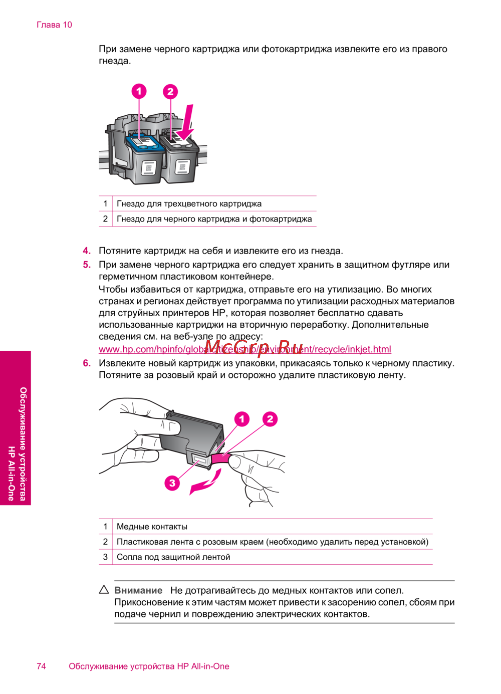 Внимание Не дотрагивайтесь до медных контактов или сопел.