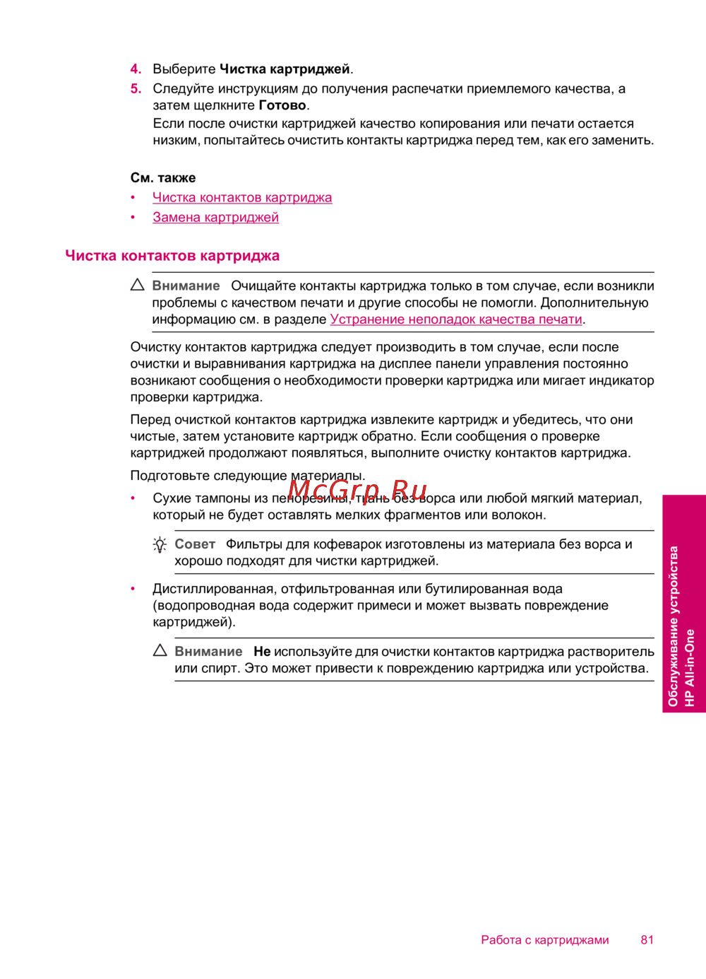 Внимание Очищайте контакты картриджа только в том случае, если возникли