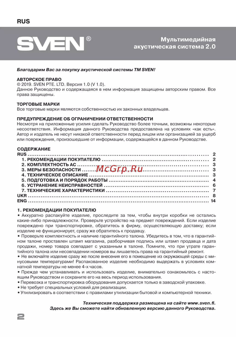 © 2019. SVEN PTE. LTD. Версия 1.0 (V 1.0).