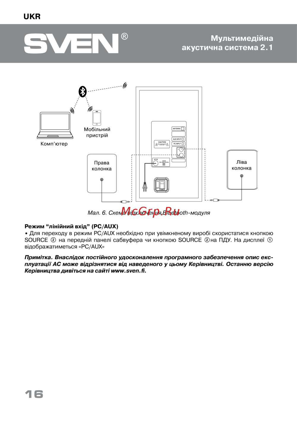 ![Sven MS-2020 [16/28] Примітка внаслідок постійного удосконалення програмного забезпечення опис екс плуатації ас може відрізнятися від наведеного у цьому керівництві останню версію керівництва дивіться на сайті www sven fi](/views2/1662857/page16/bg10.png)