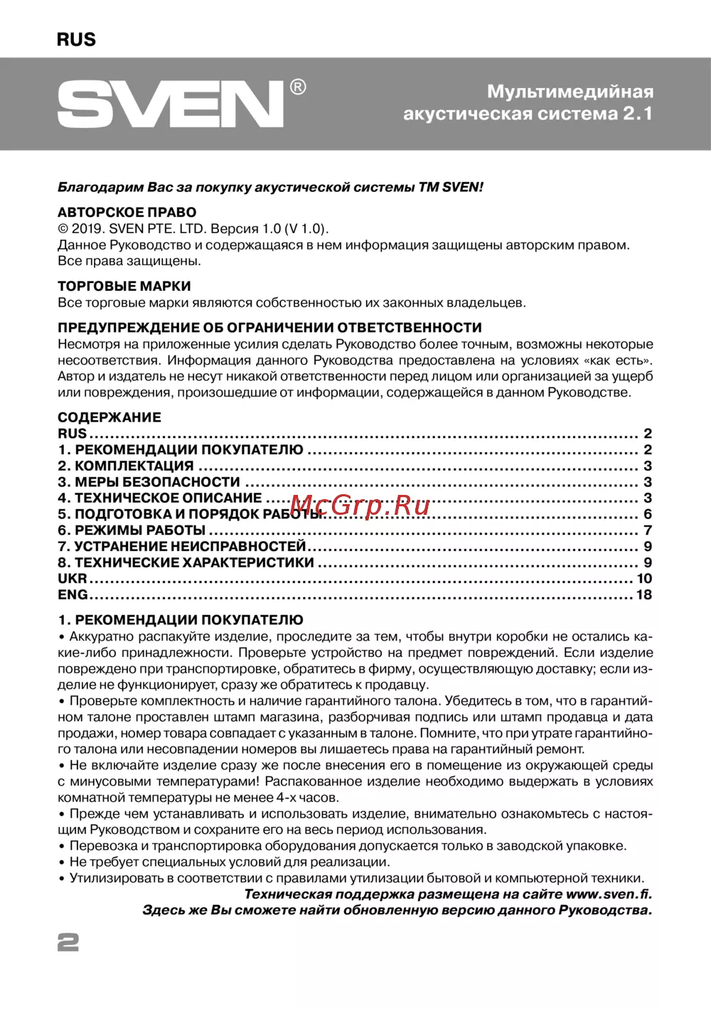 - Техническая поддержка размещена на сайте www sven fi здесь же вы сможете найти обновленную версию данного руководства p.2