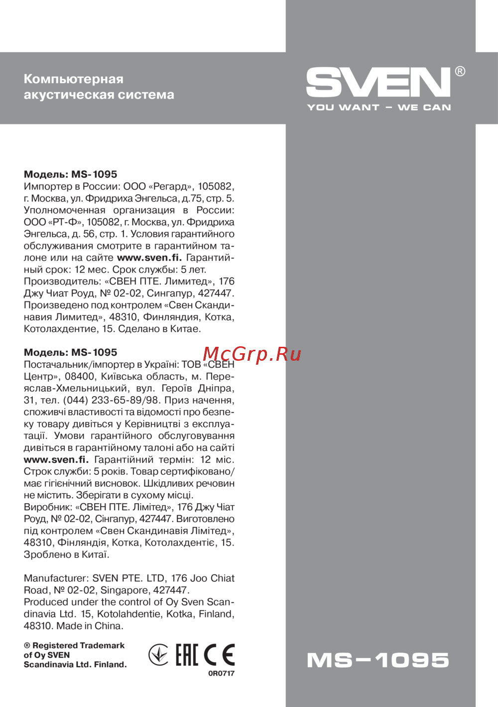 Sven MS-1095 [20/20] Ивіться в гарантійному талоні або на сайті