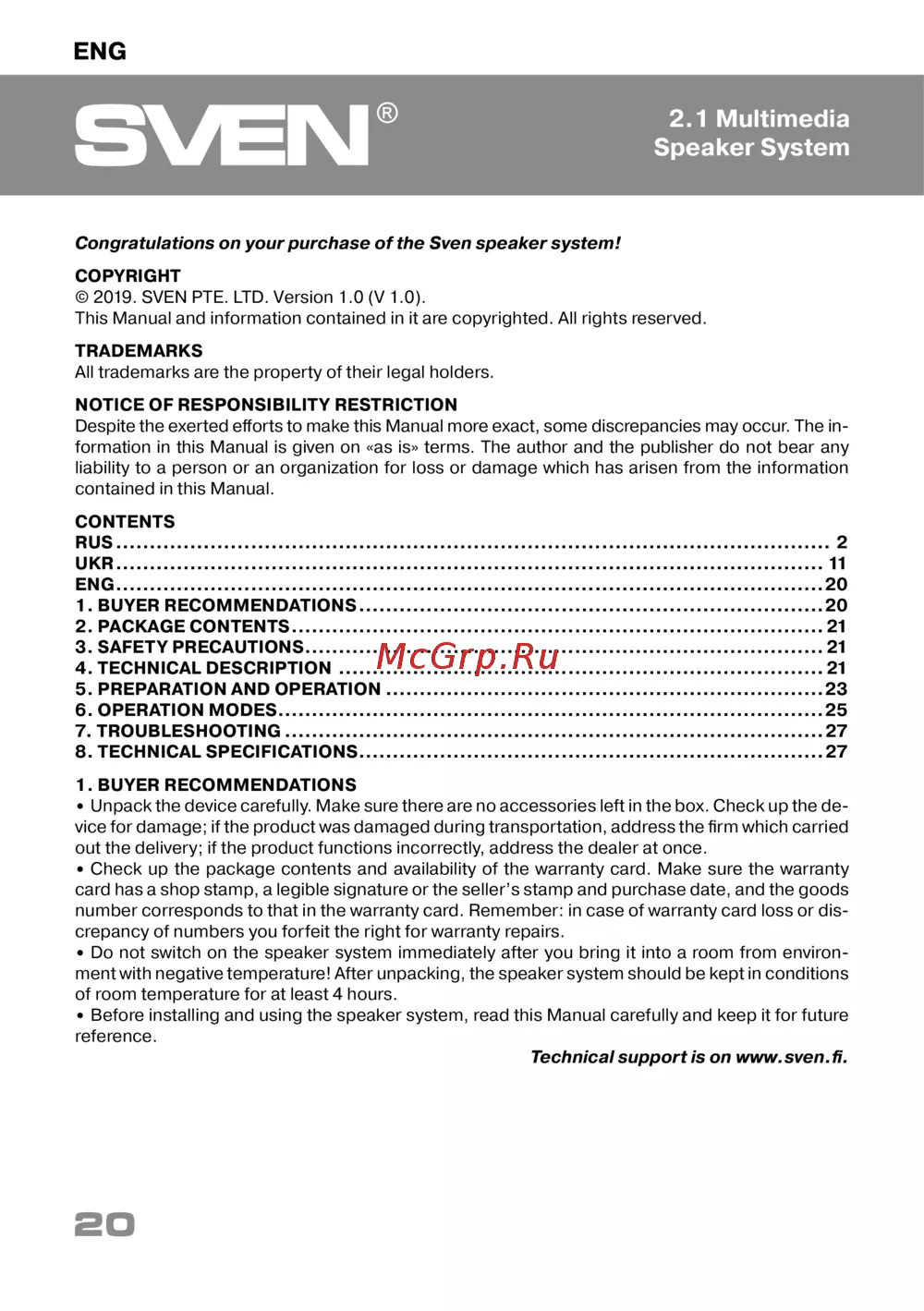 - Contents rus 2 ukr 11 eng 0 1 buyer recommendations 0 2 package contents 1 3 safety precautions 1 4 technical description 1 5 preparation and operation 3 6 operation modes 5 7 troubleshooting 7 8 technical specifications 7 p.20