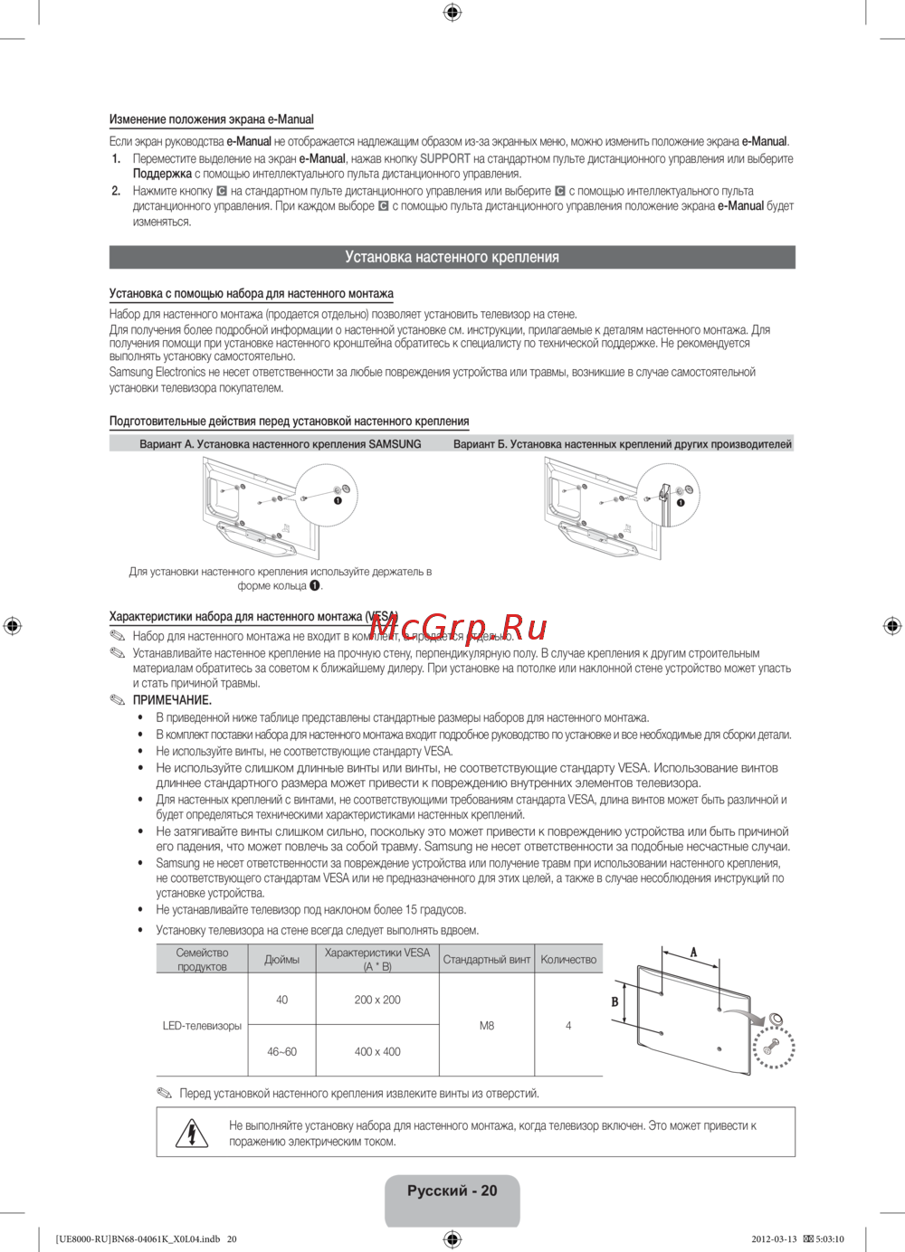 Samsung UE46 ES8000S — как изменить положение экрана e-Manual и установить настенное крепление [20/24]