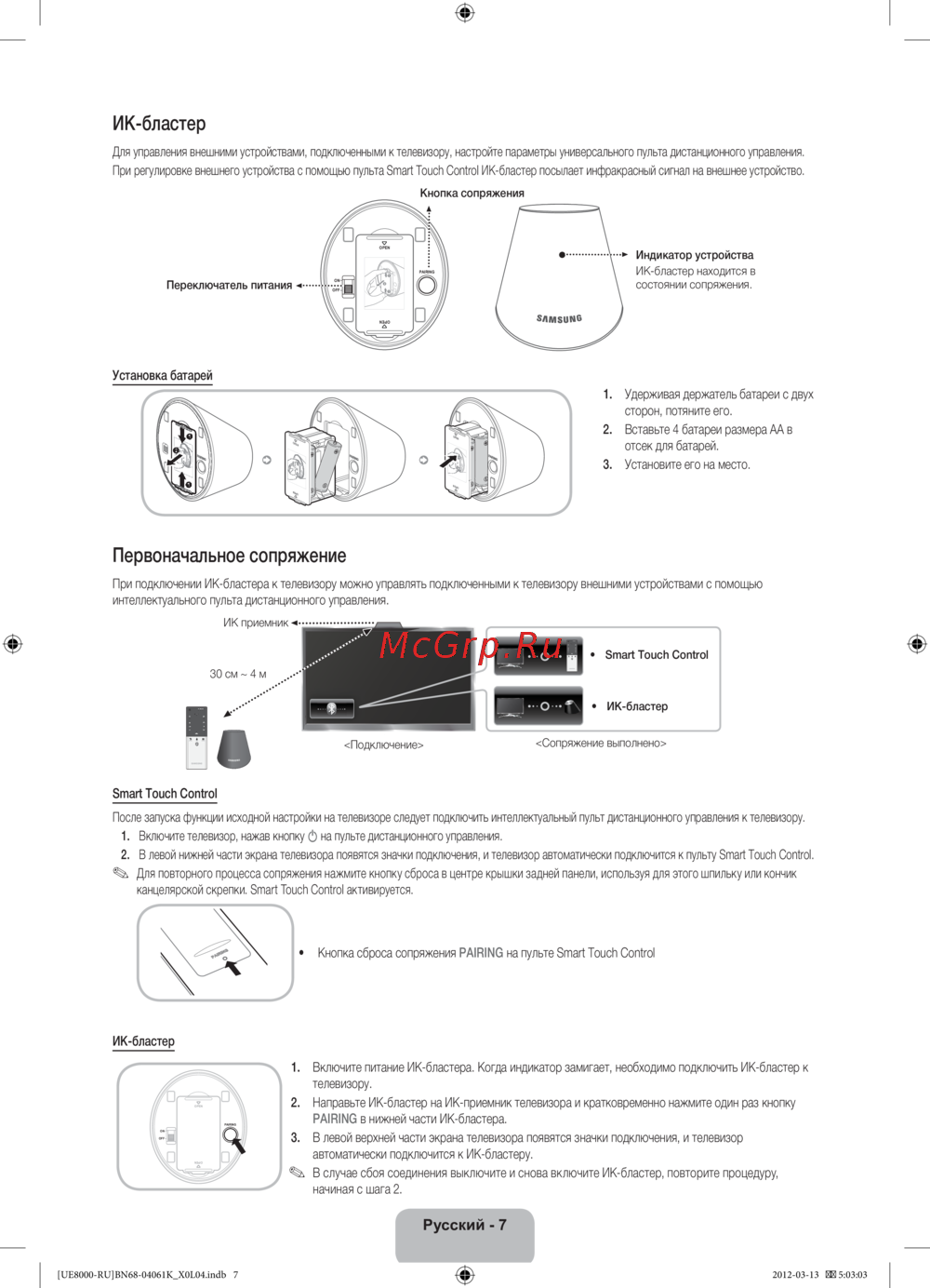 При регулировке внешнего устройства с помощью пульта Smart Touch Control ИК-бластер посылает инфракрасный сигнал на внешнее устройство.