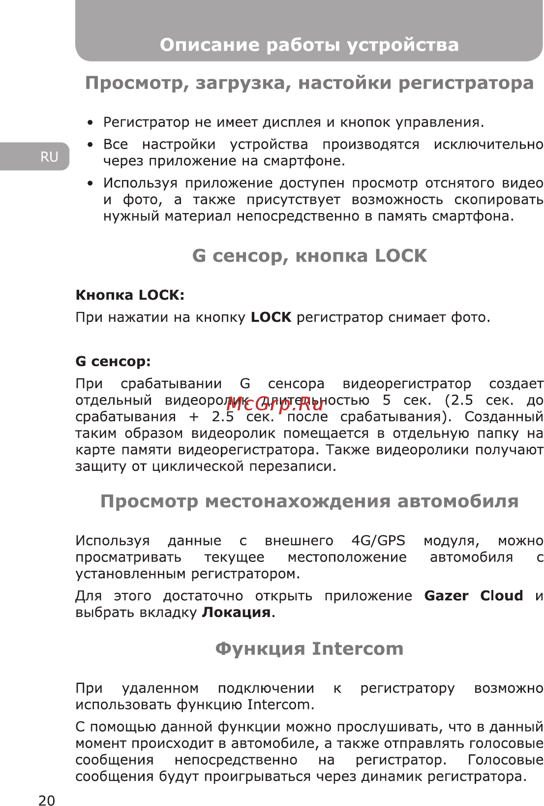 Описание работы устройства Просмотр загрузка настойки регистратора Регистратор не имеет дисплея и кнопок управления RU Все настройки устройства производятся через приложение на смартфоне исключительно Используя приложение доступен просмотр отснятого видео и фото а также присутствует возможность скопировать нужный материал непосредственно в память смартфона G сенсор кнопка LOCK Кнопка LOCK При нажатии на кнопку LOCK регистратор снимает фото G сенсор При срабатывании G сенсора видеорегистратор создает отдельный видеоролик длительностью 5 сек 2 5 сек до срабатывания 2 5 сек после срабатывания Созданный таким образом видеоролик помещается в отдельную папку на карте памяти видеорегистратора Также видеоролики получают защиту от циклической перезаписи Просмотр местонахождения автомобиля Используя данные с внешнего 4G GPS просматривать текущее местоположение установленным регистратором Для этого достаточно открыть выбрать вкладку Локация приложение модуля можно автомобиля с Gazer Cloud и Функция Intercom При удаленном подключении использовать функцию Intercom к регистратору возможно С помощью данной функции можно прослушивать что в данный момент происходит в автомобиле а также отправлять голосовые сообщения непосредственно на регистратор Голосовые сообщения будут проигрываться через динамик регистратора 20