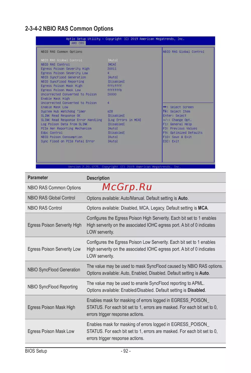 NBIO RAS Control Options available: Disabled, MCA, Legacy. Default setting is MCA.