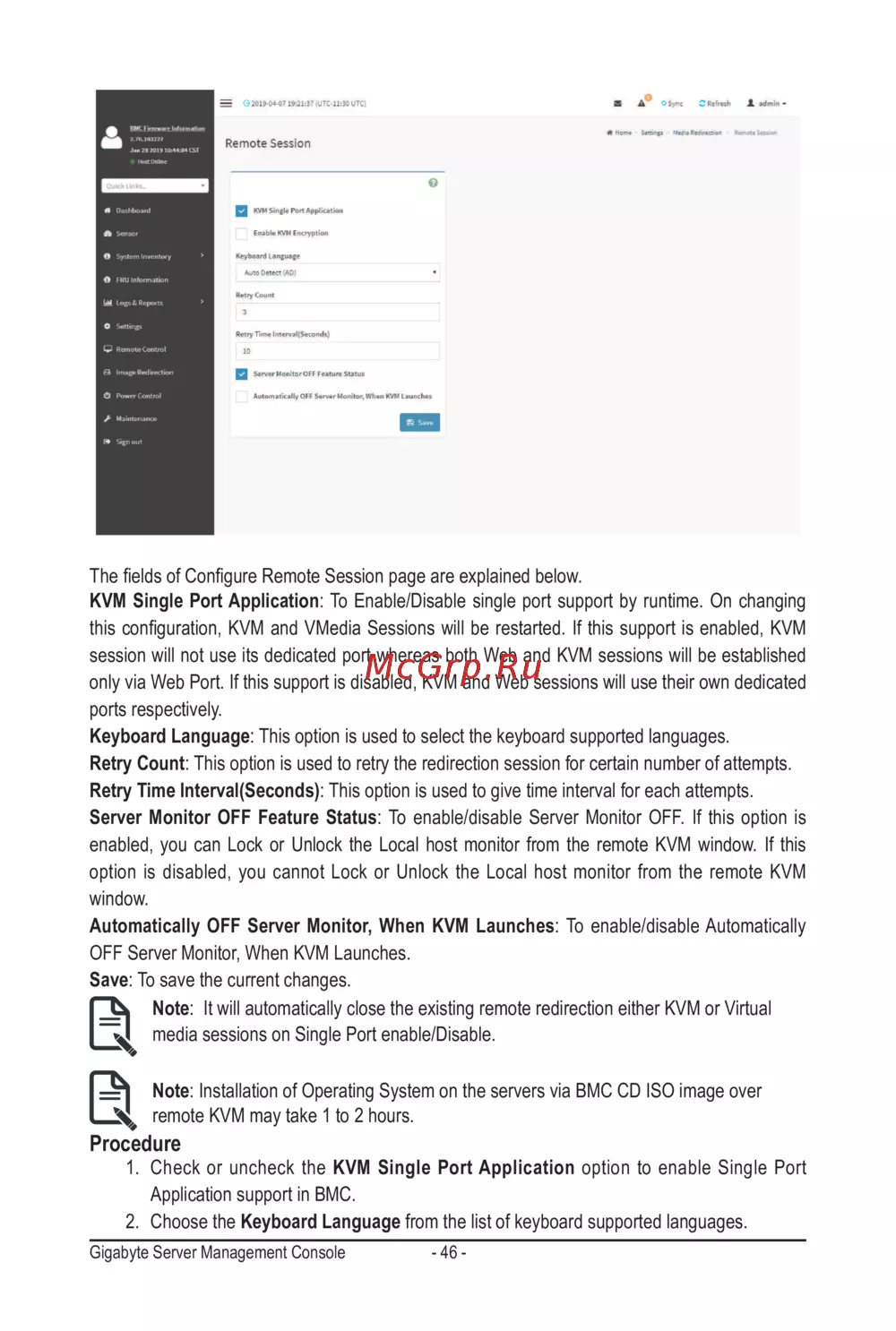 Gigabyte MZ32-AR0 (rev. 1.0) — управление удаленными сессиями на сервере: настройки и функции [46/134]