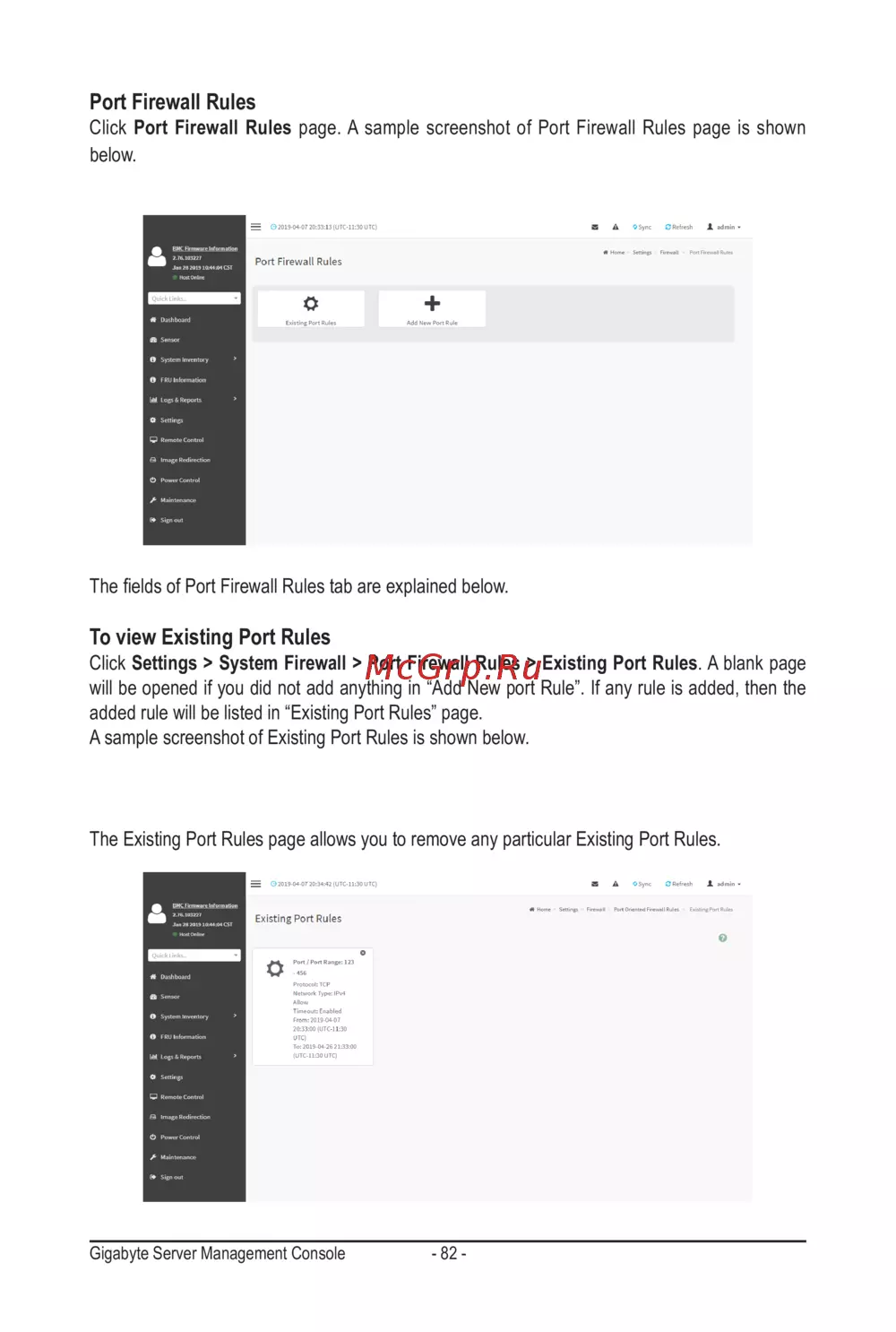 Click Port Firewall Rules page. A sample screenshot of Port Firewall Rules page is shown
