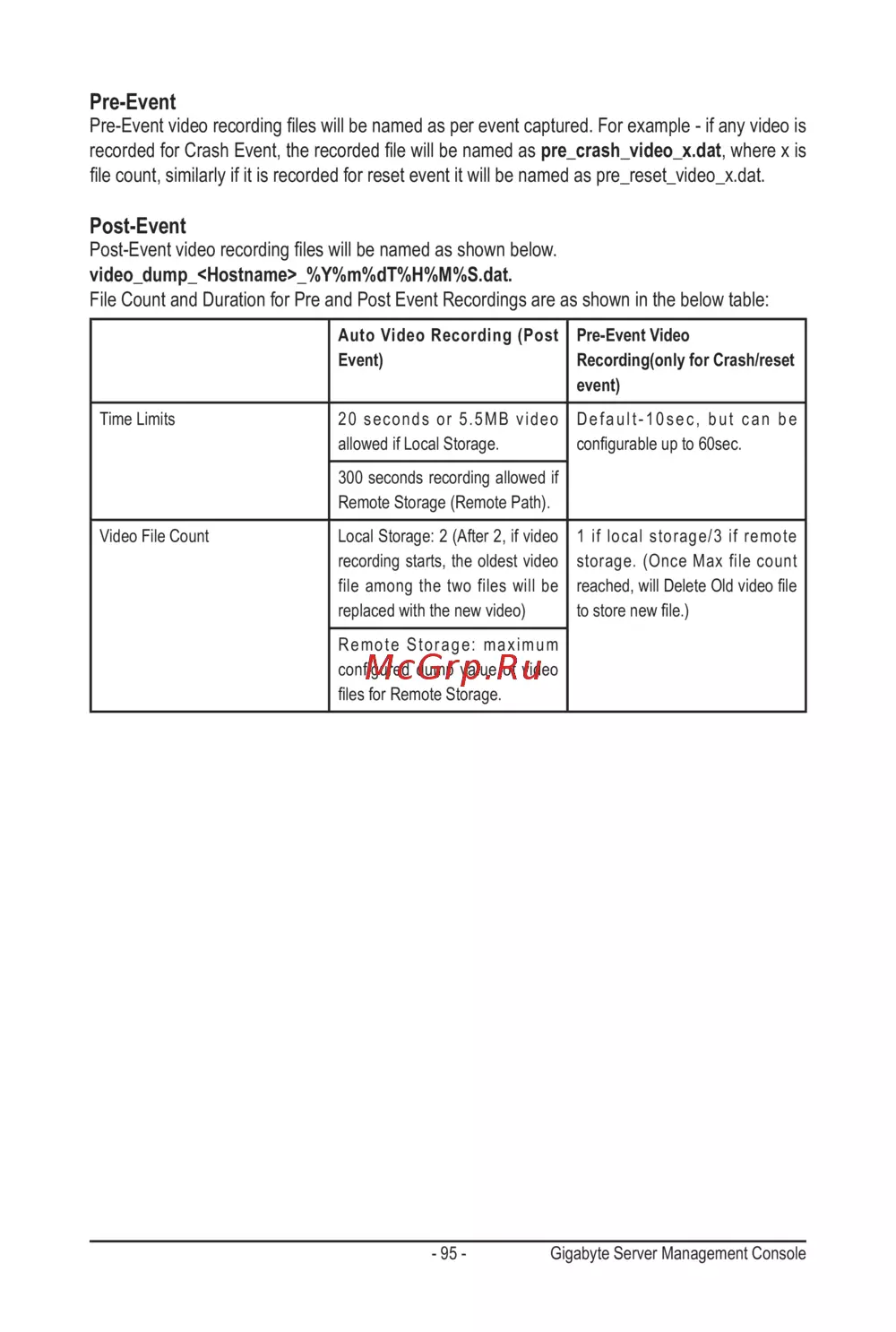 ![Gigabyte MZ71-CE1 (rev. 1.x) [95/134] _ y m dt h m s dat file count and duration for pre and post event recordings are as shown in the below table](/views2/1679890/page95/bg5f.png)