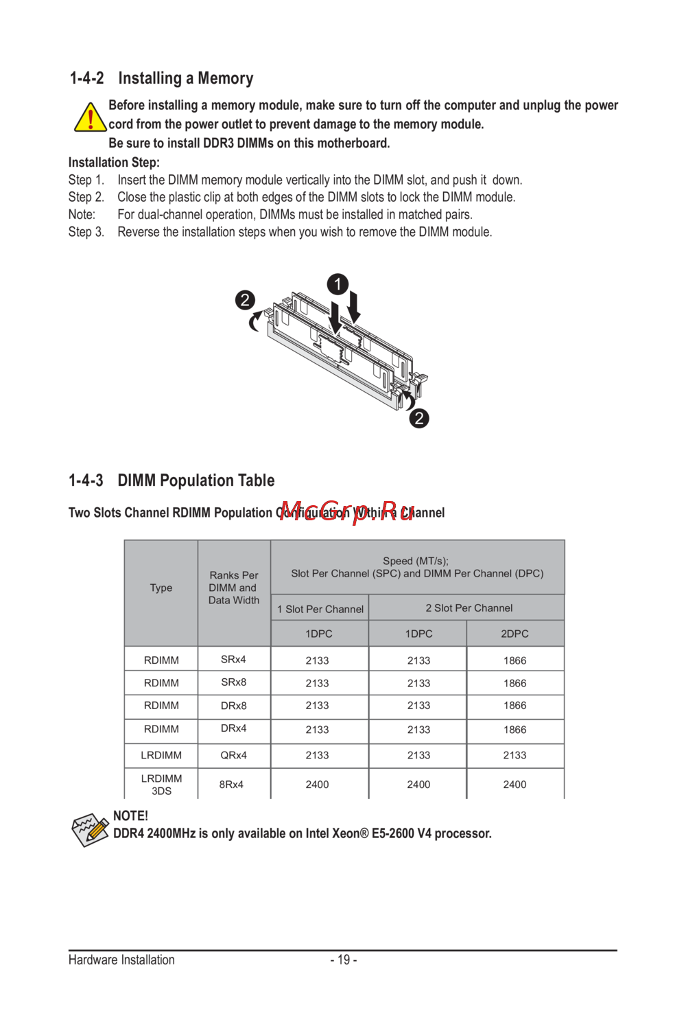 Gigabyte MH70-HD0 (rev. 1.0) [19/114] Note ddr4 2400mhz is only available on intel xeon e5 2600 v4 processor