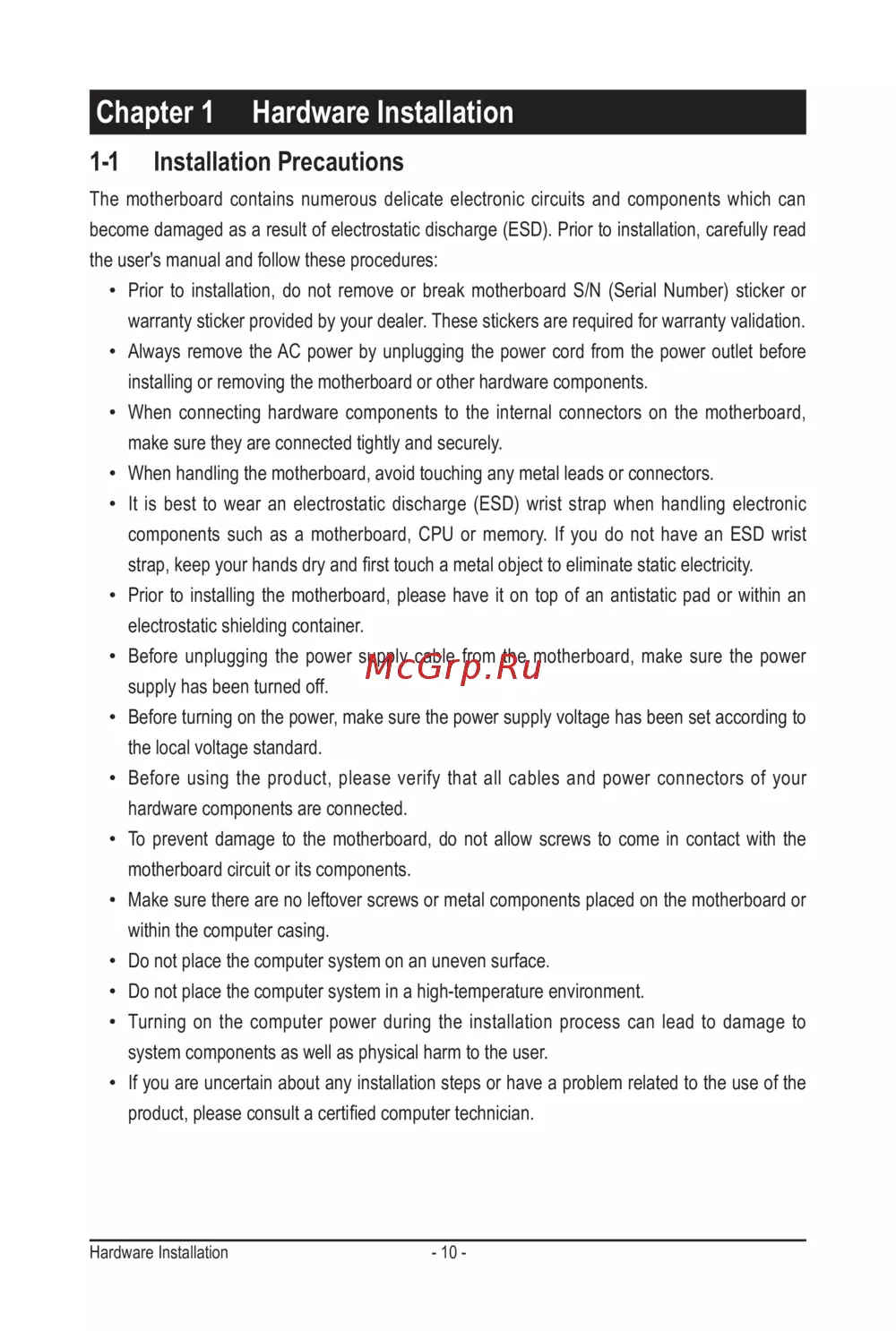 Gigabyte MD60-SC0 (rev. 1.1) — руководство по установке аппаратного обеспечения: меры предосторожности [10/127]