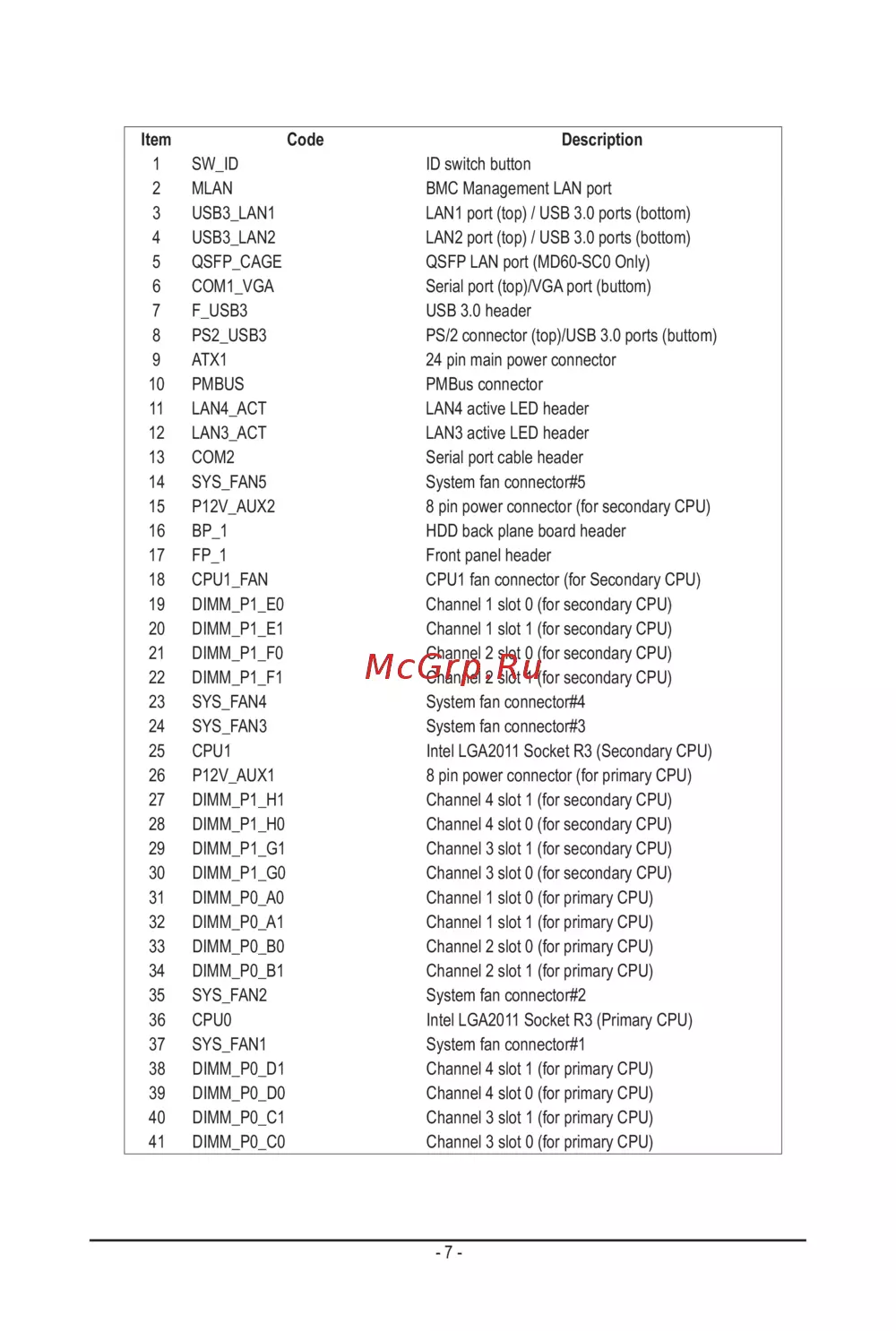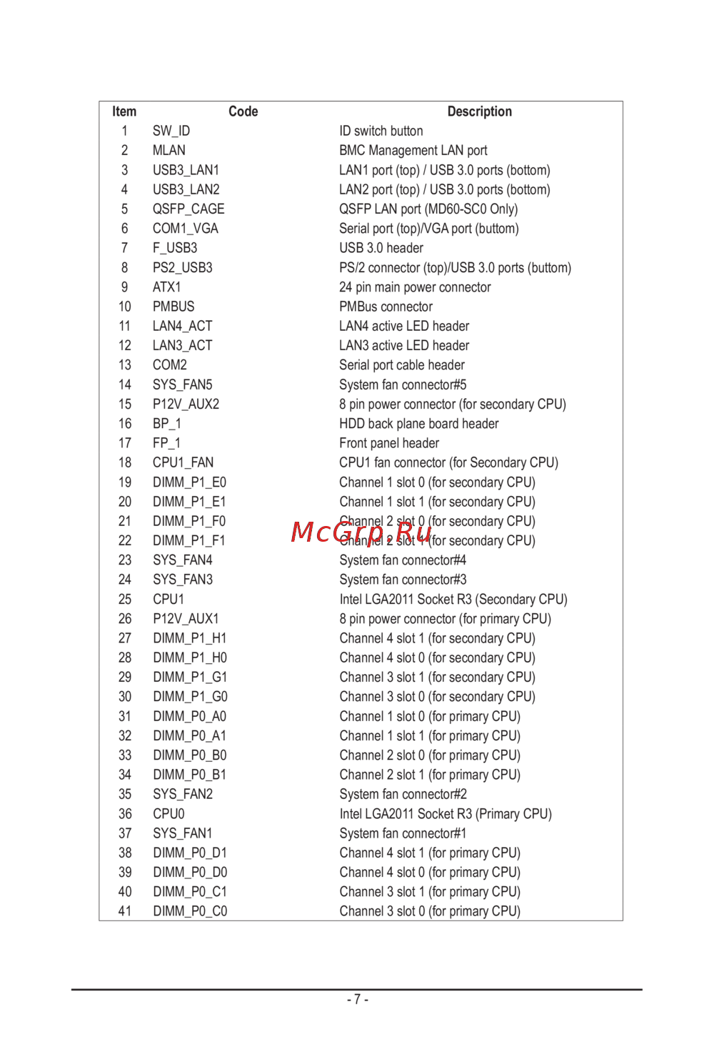 29 DIMM_P1_G1 Channel 3 slot 1 (for secondary CPU)