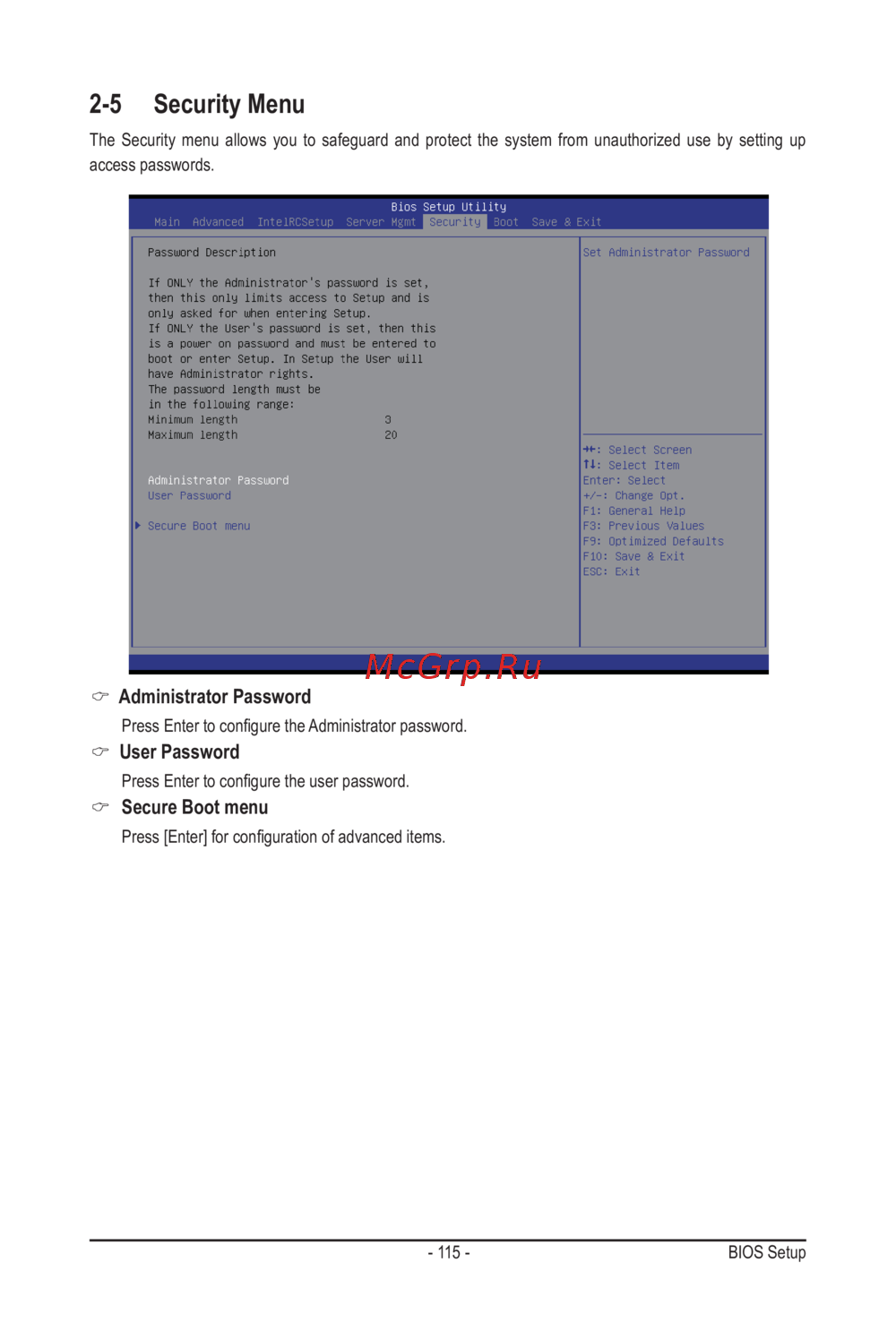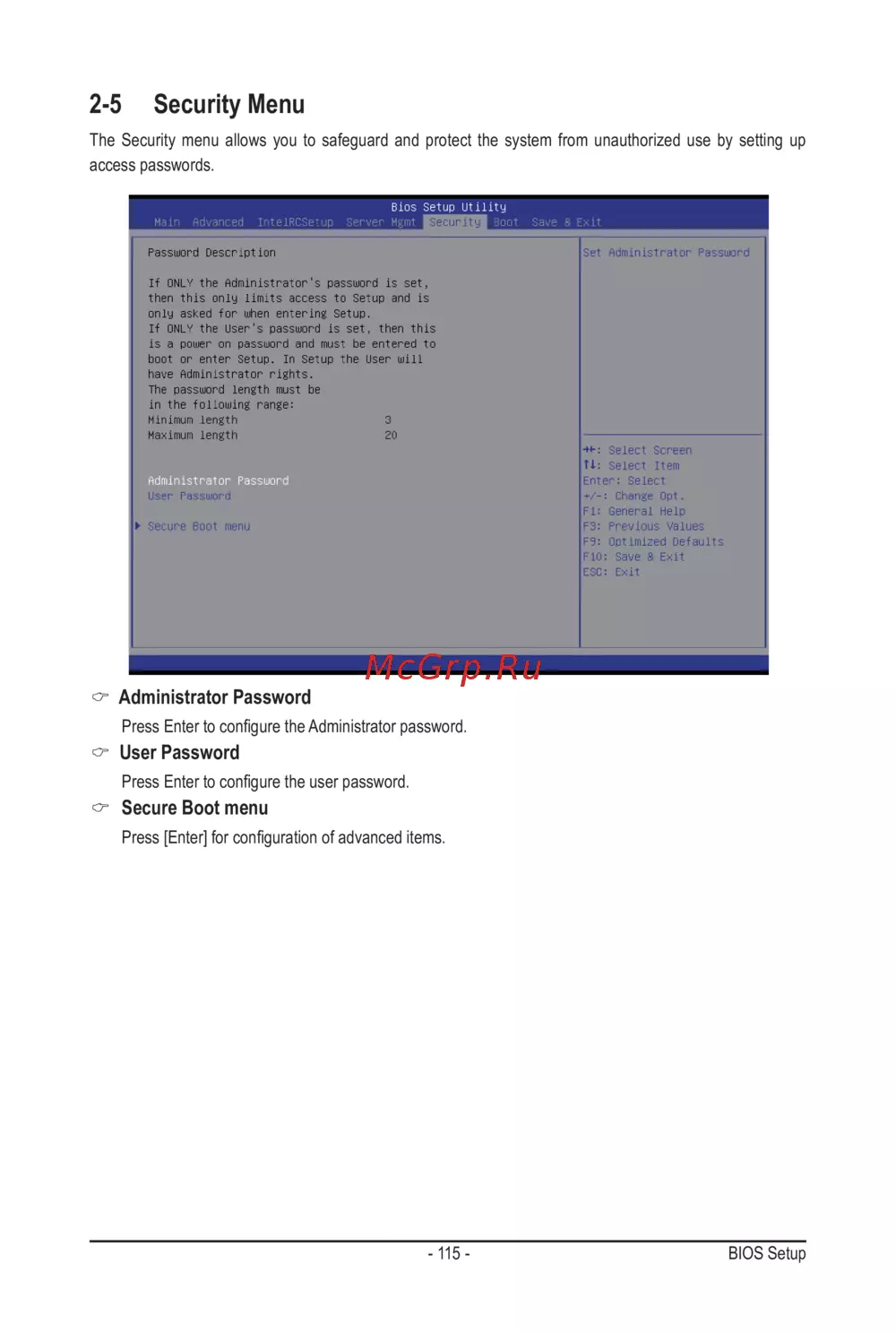 - Secure boot menu p.115
