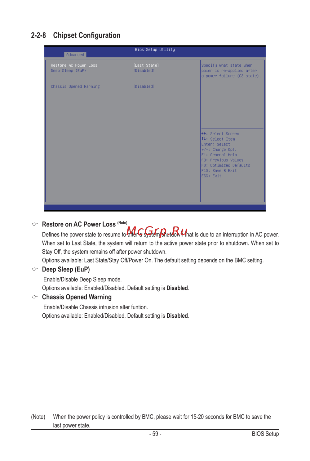 Options available: Last State/Stay Off/Power On. The default setting depends on the BMC setting.