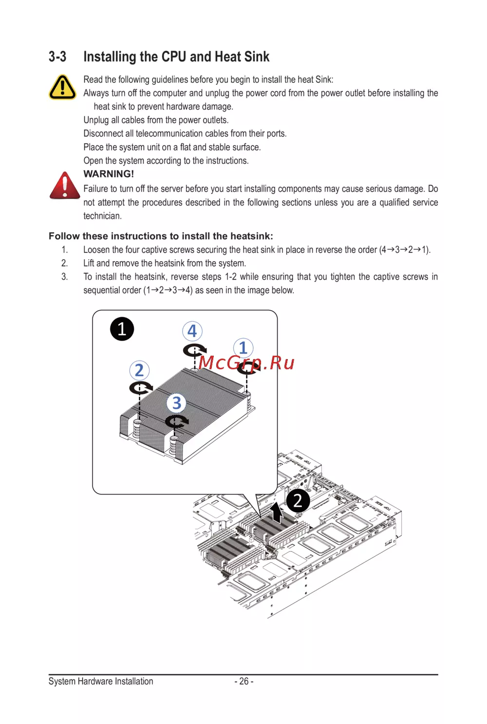 3. To install the heatsink, reverse steps 1-2 while ensuring that you tighten the captive screws in