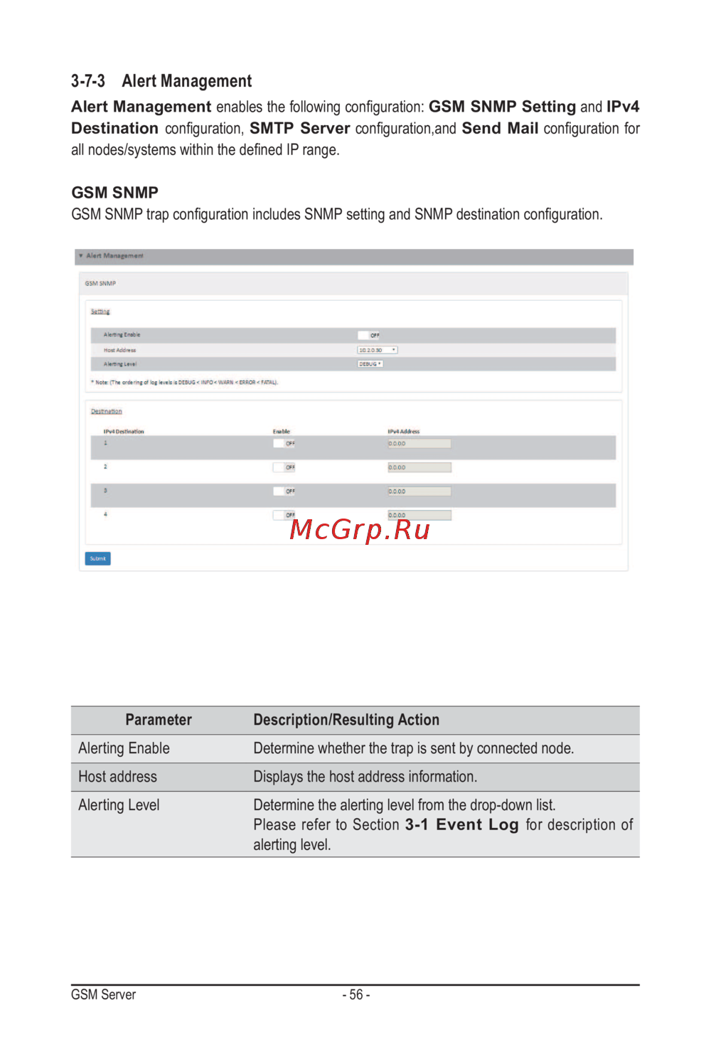 Alert Management enablesthefollowingconguration:GSM SNMP Setting and IPv4
