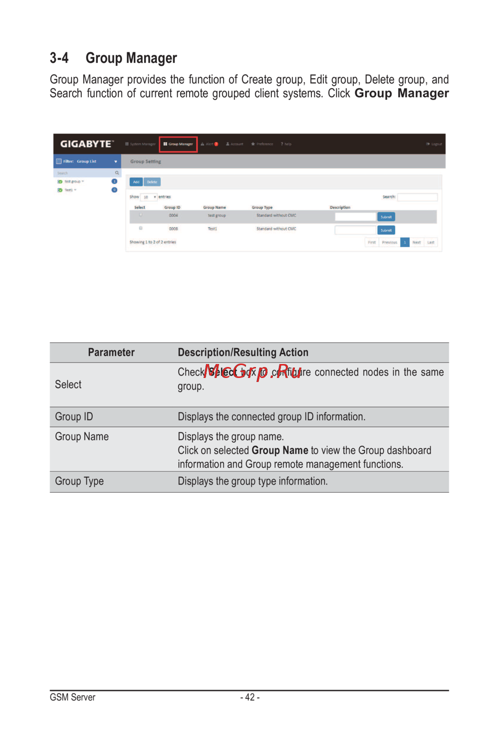 Gigabyte H262-Z6A (rev. 100) [42/68] Group manager provides the function of create group edit group delete group and search function of current remote grouped client systems click group manager