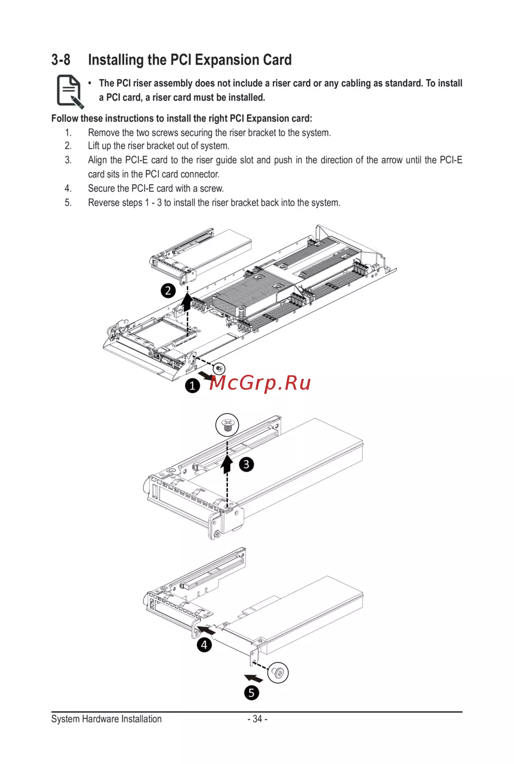 3. Align the PCI-E card to the riser guide slot and push in the direction of the arrow until the PCI-E