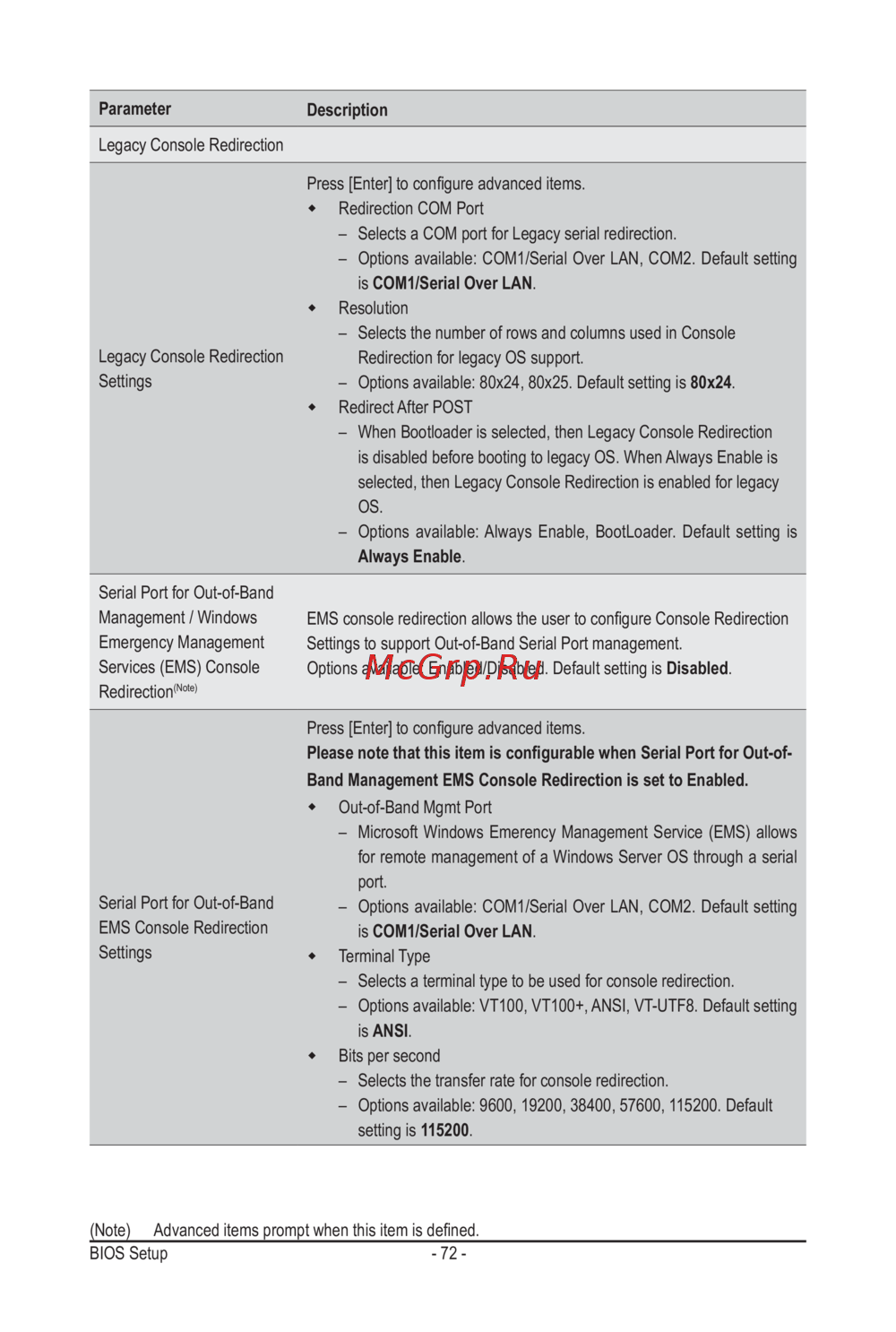 – Options available: COM1/Serial Over LAN, COM2. Default setting