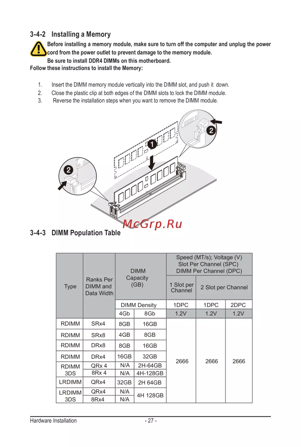 Gigabyte H261-3C0 (rev. 100) [27/123] Insert the dimm memory module vertically into the dimm slot and push it down 2 close the plastic clip at both edges of the dimm slots to lock the dimm module 3 reverse the installation steps when you want to remove the dimm module