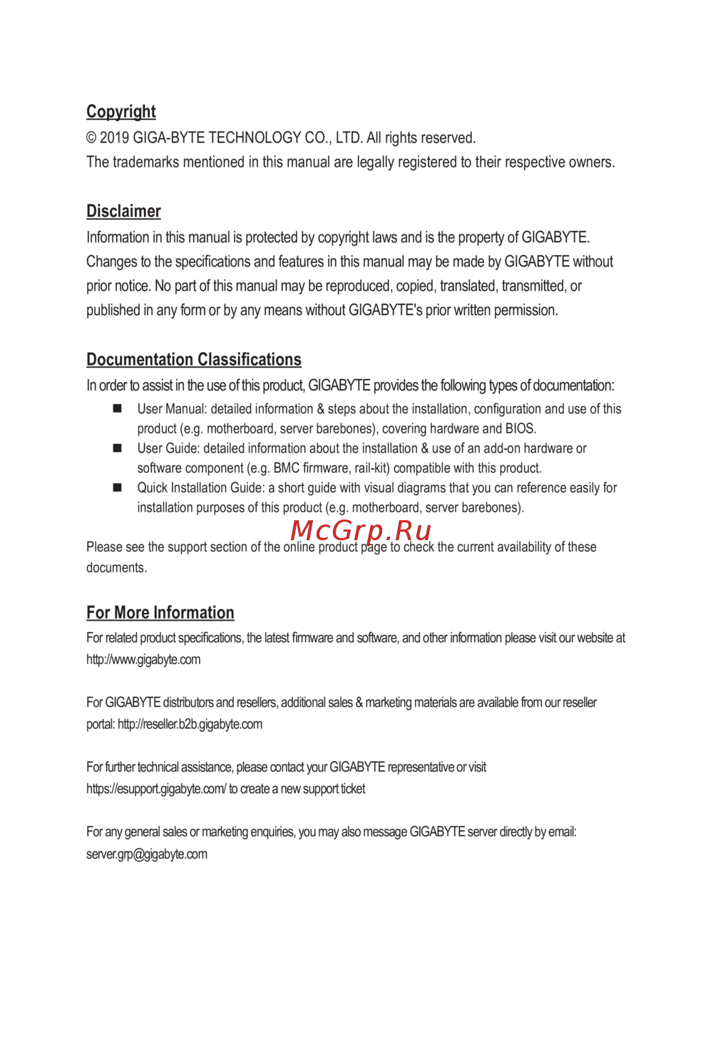![Gigabyte H261-Z60 (rev. A00) [2/130] Information in this manual is protected by copyright laws and is the property of gigabyte changes to the specifications and features in this manual may be made by gigabyte without prior notice no part of this manual may be reproduced copied translated transmitted or published in any form or by any means without gigabyte s prior written permission](/views2/1681270/page2/bg2.png)