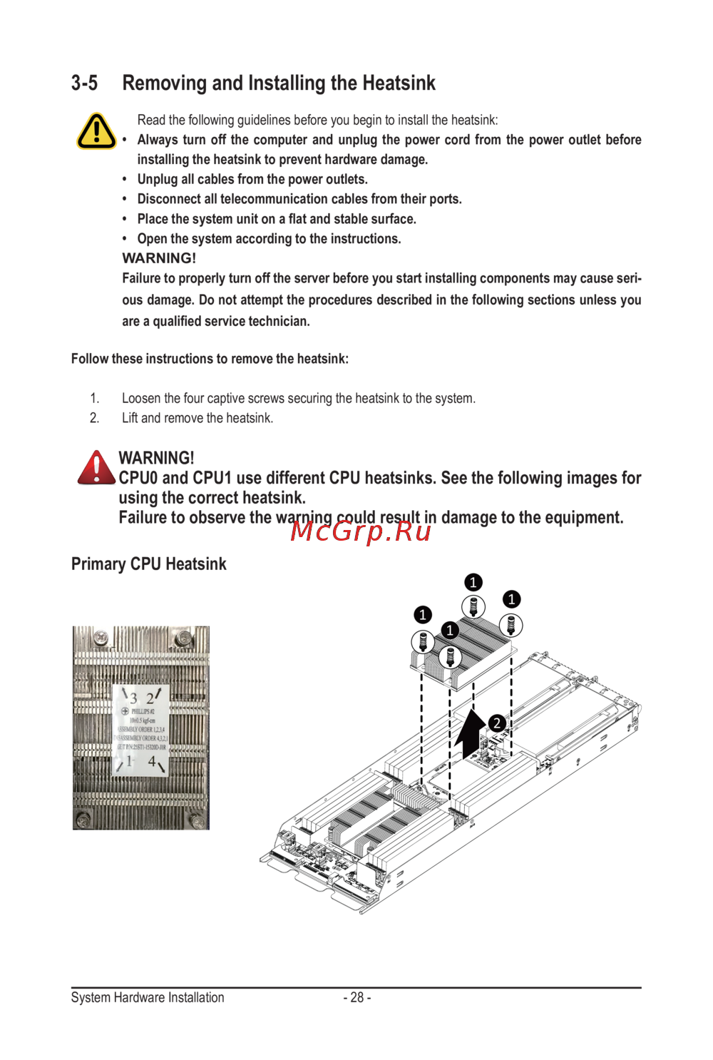 - Warning cpu0 and cpu1 use different cpu heatsinks see the following images for using the correct heatsink failure to observe the warning could result in damage to the equipment p.28