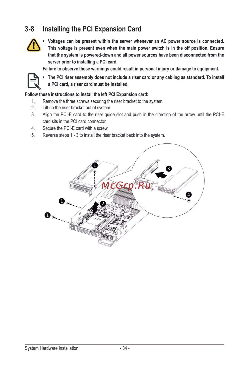 3. Align the PCI-E card to the riser guide slot and push in the direction of the arrow until the PCI-E