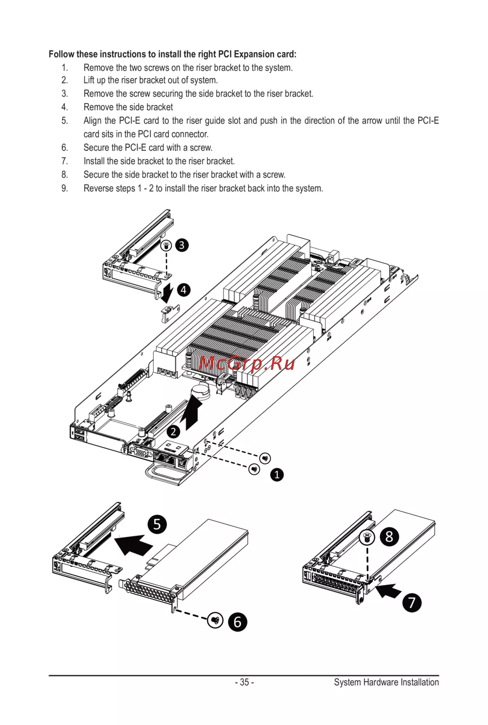 5. Align the PCI-E card to the riser guide slot and push in the direction of the arrow until the PCI-E
