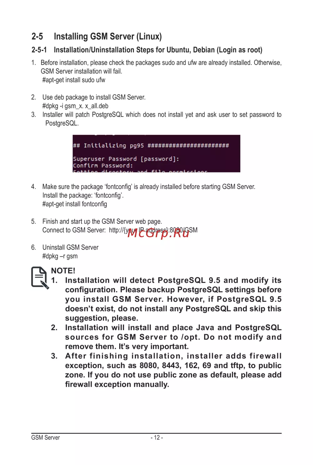 - Note 1 installation will detect postgresql 9 and modify its configuration please backup postgresql settings before you install gsm server however if postgresql 9 doesn t exist do not install any postgresql and skip this suggestion please 2 installation will install and place java and postgresql sources for gsm server to opt do not modify and remove them it s very important 3 after finishing installation installer adds firewall exception such as 8080 8443 162 69 and tftp to public zone if you do not use public zone as default please add firewall exception manually p.12