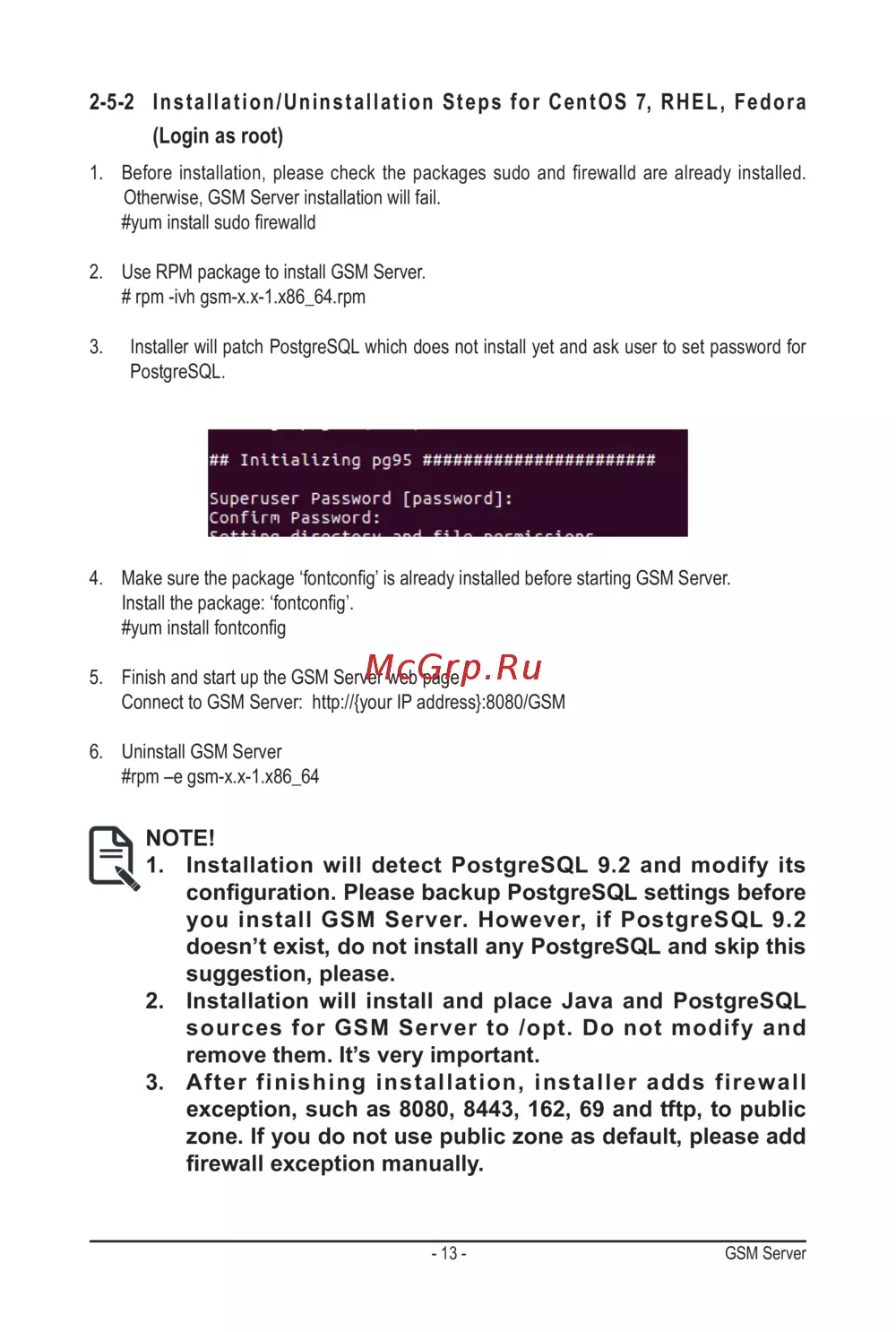 - Note 1 installation will detect postgresql 9 and modify its configuration please backup postgresql settings before you install gsm server however if postgresql 9 doesn t exist do not install any postgresql and skip this suggestion please 2 installation will install and place java and postgresql sources for gsm server to opt do not modify and remove them it s very important 3 after finishing installation installer adds firewall exception such as 8080 8443 162 69 and tftp to public zone if you do not use public zone as default please add firewall exception manually p.13